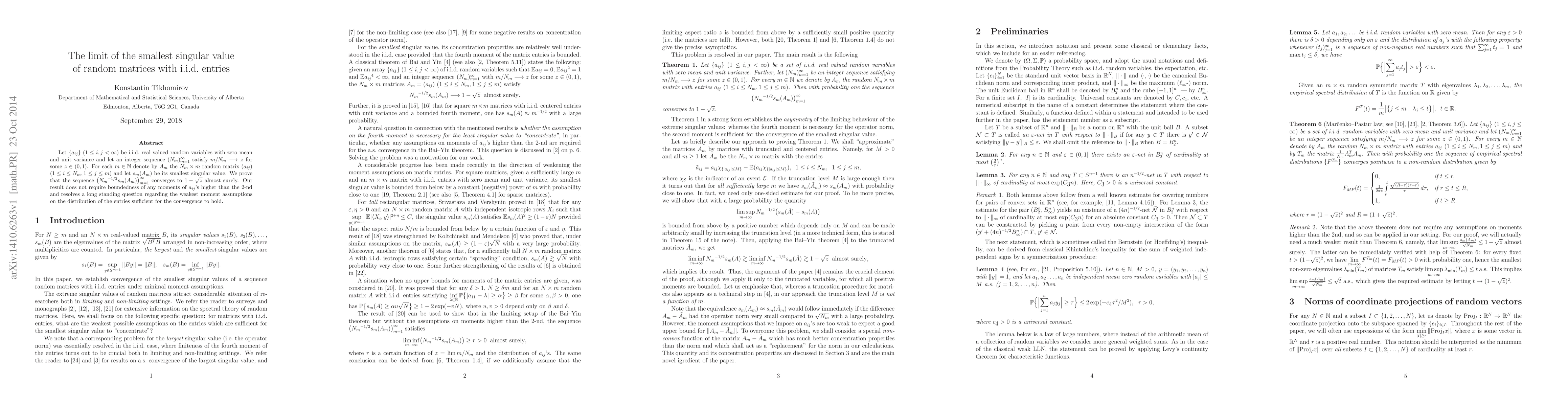 Let $\{a_{ij}\}$ $(1\le i,j<\infty)$ be i.i.d. real valued random variables with zero mean and unit variance and let an integer sequence $(N_m)_{m=1}^\infty$ satisfy $m/N_m\longrightarrow z$ for some $z\in(0,1)$. For each $m\in{\mathbb N}$ denote by $A_m$ the $N_m\times m$ random matrix $(a_{ij})$ $(1\le i\le N_m,1\le j\le m)$ and let $s_{m}(A_m)$ be its smallest singular value. We prove that the sequence $\bigl({N_m}^{-1/2} s_{m}(A_m)\bigr)_{m=1}^\infty$ converges to $1-\sqrt{z}$ almost surely. Our result does not require boundedness of any moments of $a_{ij}$'s higher than the $2$-nd and resolves a long standing question regarding the weakest moment assumptions on the distribution of the entries sufficient for the convergence to hold.
