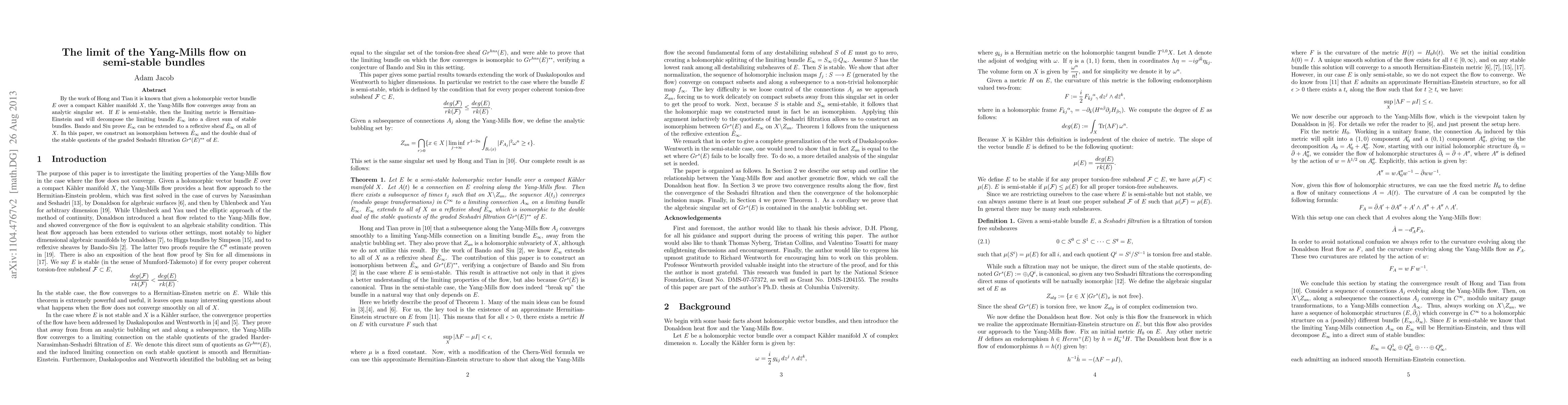By the work of Hong and Tian it is known that given a holomorphic vector bundle E over a compact Kahler manifold X, the Yang-Mills flow converges away from an analytic singular set. If E is semi-stable, then the limiting metric is Hermitian-Einstein and will decompose the limiting bundle into a direct sum of stable bundles. Bando and Siu prove this limiting bundle can be extended to a reflexive sheaf E' on all of X. In this paper, we construct an isomorphism between E' and the double dual of the stable quotients of the graded Seshadri filtration of E.