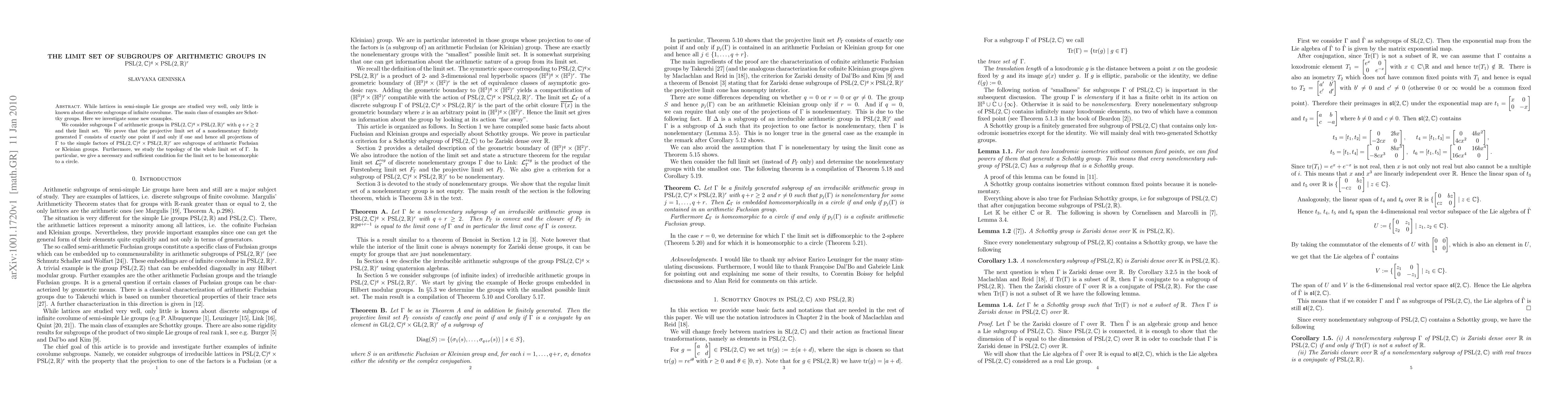 While lattices in semi-simple Lie groups are studied very well, only little is known about discrete subgroups of infinite covolume. The main class of examples are Schottky groups. Here we investigate some new examples. We consider subgroups $\Gamma$ of arithmetic groups in $PSL(2,C)^q \times PSL(2,R)^r$ with $q+r>1$ and their limit set. We prove that the projective limit set of a nonelementary finitely generated $\Gamma$ consists of exactly one point if and only if one and hence all projections of $\Gamma$ to the simple factors of $PSL(2,C)^q \times PSL(2,R)^r$ are subgroups of arithmetic Fuchsian or Kleinian groups. Furthermore, we study the topology of the whole limit set of $\Gamma$. In particular, we give a necessary and sufficient condition for the limit set to be homeomorphic to a circle.