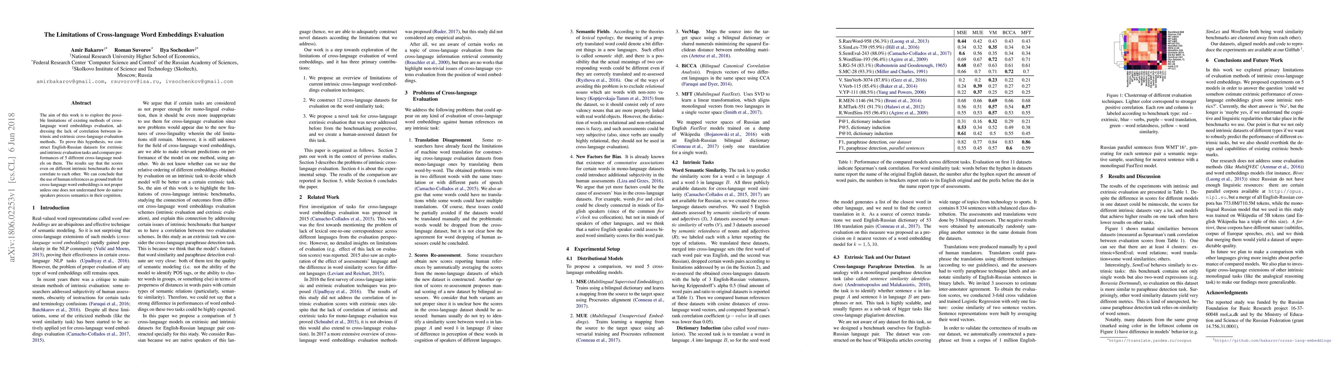 This paper investigates the limitations of cross-language word embeddings evaluation, finding that intrinsic and extrinsic methods lack correlation. Through experiments comparing five models on English-Russian datasets, it concludes that human-based ground truths are inadequate without deeper understanding of native semantics.