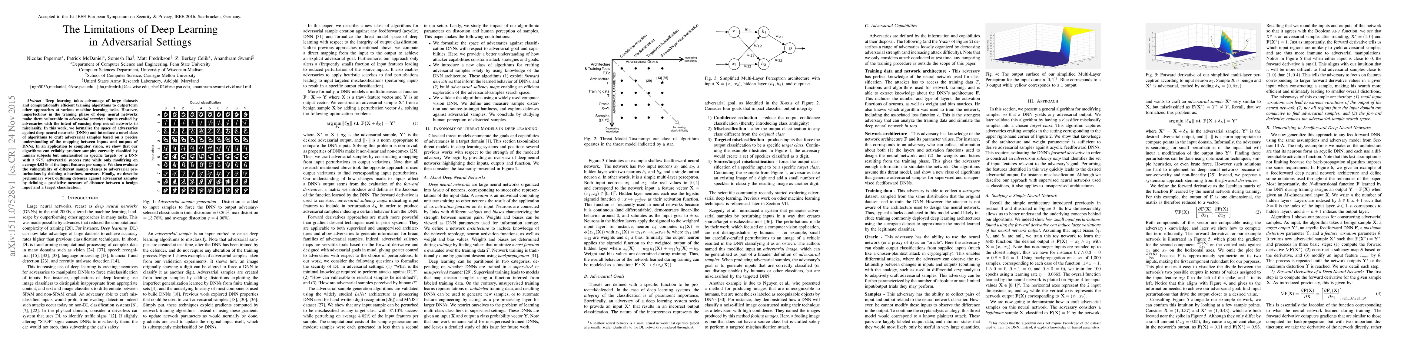 Deep learning takes advantage of large datasets and computationally efficient training algorithms to outperform other approaches at various machine learning tasks. However, imperfections in the training phase of deep neural networks make them vulnerable to adversarial samples: inputs crafted by adversaries with the intent of causing deep neural networks to misclassify. In this work, we formalize the space of adversaries against deep neural networks (DNNs) and introduce a novel class of algorithms to craft adversarial samples based on a precise understanding of the mapping between inputs and outputs of DNNs. In an application to computer vision, we show that our algorithms can reliably produce samples correctly classified by human subjects but misclassified in specific targets by a DNN with a 97% adversarial success rate while only modifying on average 4.02% of the input features per sample. We then evaluate the vulnerability of different sample classes to adversarial perturbations by defining a hardness measure. Finally, we describe preliminary work outlining defenses against adversarial samples by defining a predictive measure of distance between a benign input and a target classification.