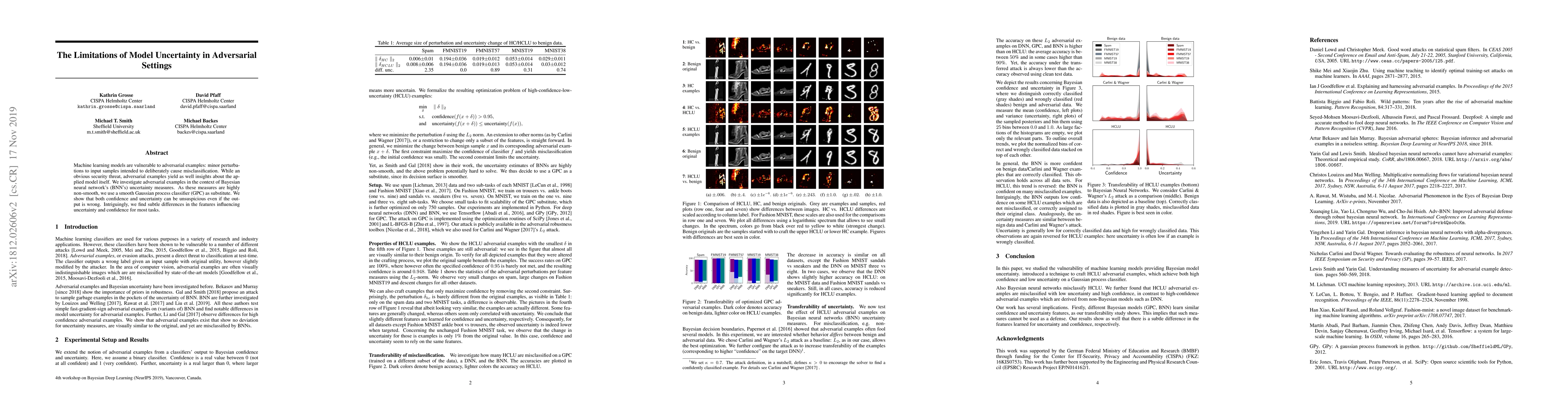 Machine learning models are vulnerable to adversarial examples: minor perturbations to input samples intended to deliberately cause misclassification. While an obvious security threat, adversarial examples yield as well insights about the applied model itself. We investigate adversarial examples in the context of Bayesian neural network's (BNN's) uncertainty measures. As these measures are highly non-smooth, we use a smooth Gaussian process classifier (GPC) as substitute. We show that both confidence and uncertainty can be unsuspicious even if the output is wrong. Intriguingly, we find subtle differences in the features influencing uncertainty and confidence for most tasks.
