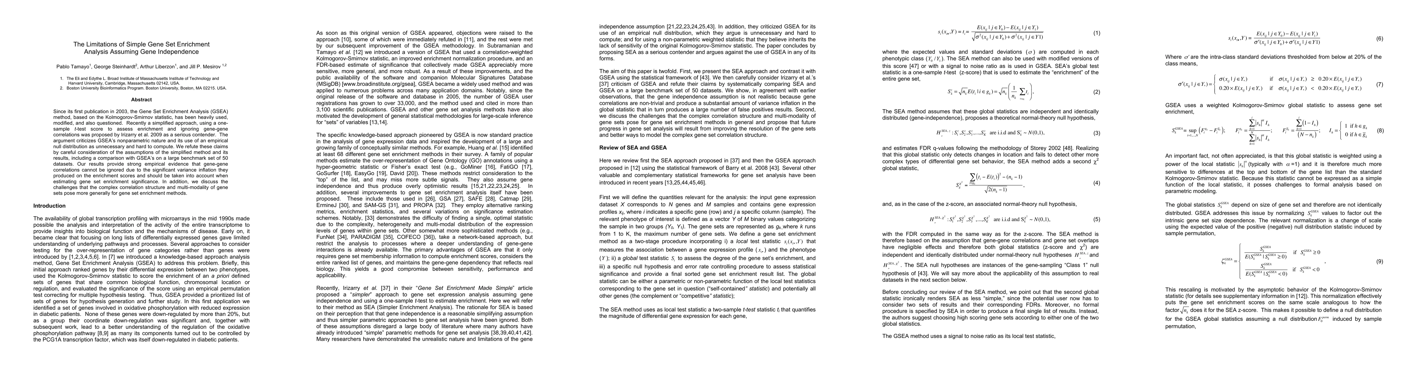 Since its first publication in 2003, the Gene Set Enrichment Analysis (GSEA) method, based on the Kolmogorov-Smirnov statistic, has been heavily used, modified, and also questioned. Recently a simplified approach, using a one sample t test score to assess enrichment and ignoring gene-gene correlations was proposed by Irizarry et al. 2009 as a serious contender. The argument criticizes GSEA's nonparametric nature and its use of an empirical null distribution as unnecessary and hard to compute. We refute these claims by careful consideration of the assumptions of the simplified method and its results, including a comparison with GSEA's on a large benchmark set of 50 datasets. Our results provide strong empirical evidence that gene-gene correlations cannot be ignored due to the significant variance inflation they produced on the enrichment scores and should be taken into account when estimating gene set enrichment significance. In addition, we discuss the challenges that the complex correlation structure and multi-modality of gene sets pose more generally for gene set enrichment methods.