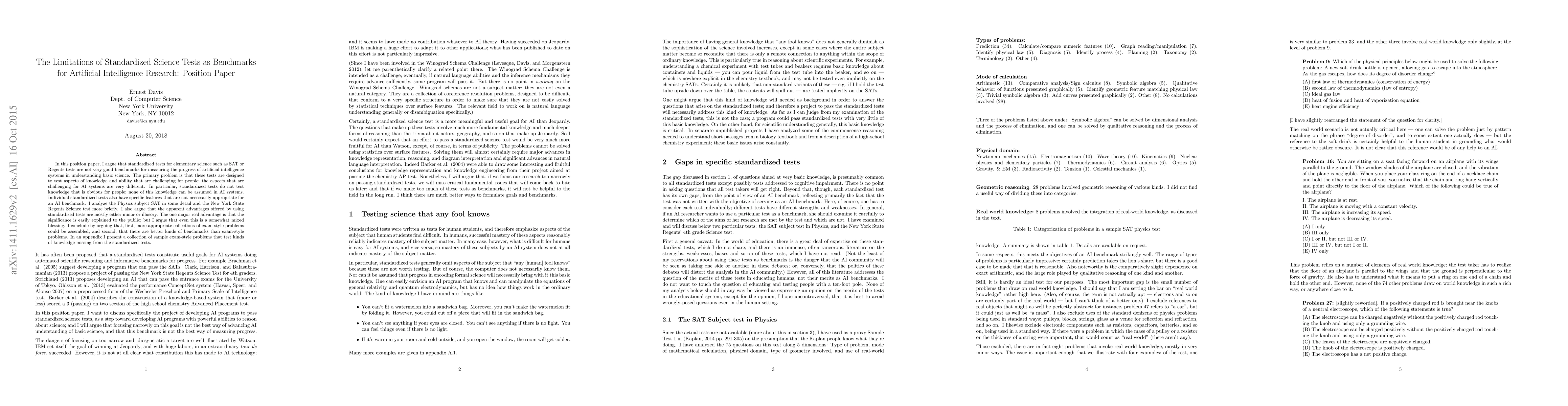 In this position paper, I argue that standardized tests for elementary science such as SAT or Regents tests are not very good benchmarks for measuring the progress of artificial intelligence systems in understanding basic science. The primary problem is that these tests are designed to test aspects of knowledge and ability that are challenging for people; the aspects that are challenging for AI systems are very different. In particular, standardized tests do not test knowledge that is obvious for people; none of this knowledge can be assumed in AI systems. Individual standardized tests also have specific features that are not necessarily appropriate for an AI benchmark. I analyze the Physics subject SAT in some detail and the New York State Regents Science test more briefly. I also argue that the apparent advantages offered by using standardized tests are mostly either minor or illusory. The one major real advantage is that the significance is easily explained to the public; but I argue that even this is a somewhat mixed blessing. I conclude by arguing that, first, more appropriate collections of exam style problems could be assembled, and second, that there are better kinds of benchmarks than exam-style problems. In an appendix I present a collection of sample exam-style problems that test kinds of knowledge missing from the standardized tests.