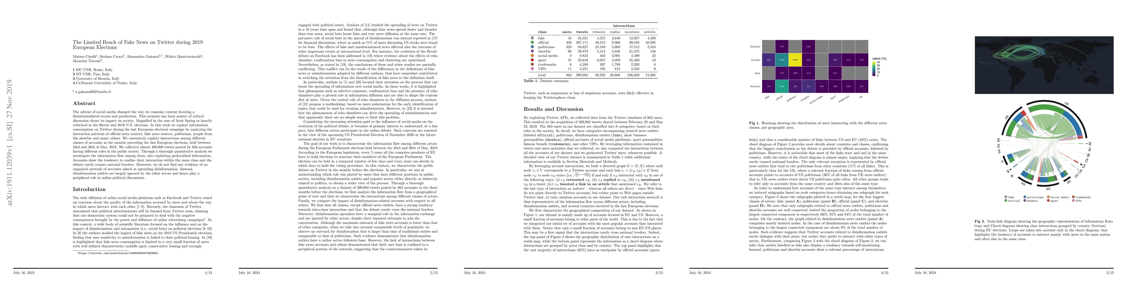This paper examines Twitter interactions during the 2019 European elections, finding that fake news sources are largely ignored by official news and political accounts, indicating limited reach and influence of disinformation. The study reveals that information flows within specific account classes and rarely crosses national borders.