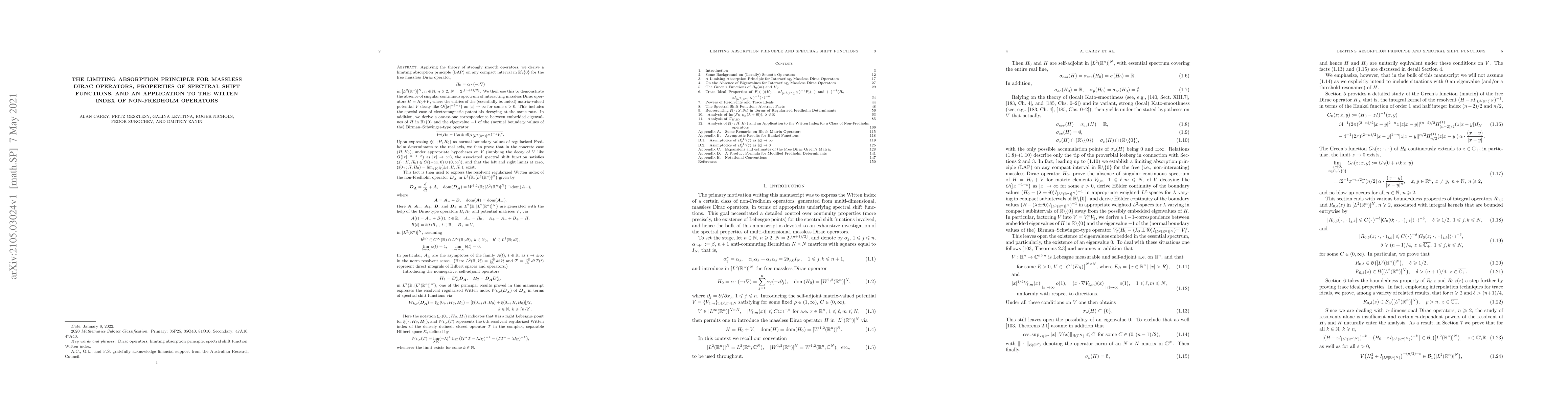 Researchers derive a limiting absorption principle for massless Dirac operators, proving they have no singular continuous spectrum, with implications for understanding the Witten index of non-Fredholm operators.