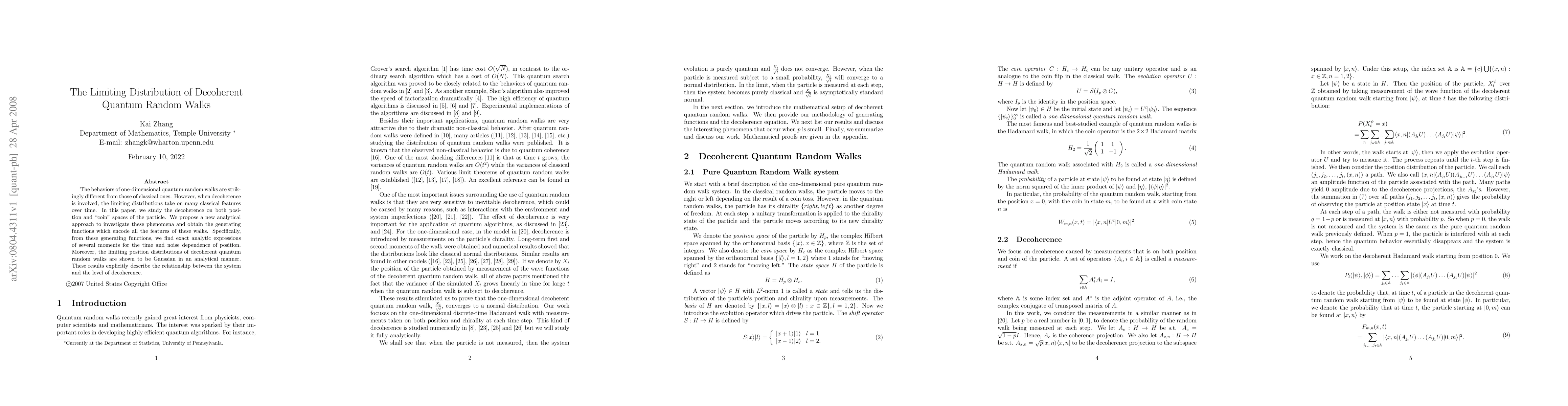 This paper investigates the limiting distribution of decoherent quantum random walks in one dimension, showing how decoherence leads to classical features over time. The authors propose a new analytical approach to derive generating functions and exact analytic expressions for moments, revealing Gaussian limiting distributions as decoherence increases.