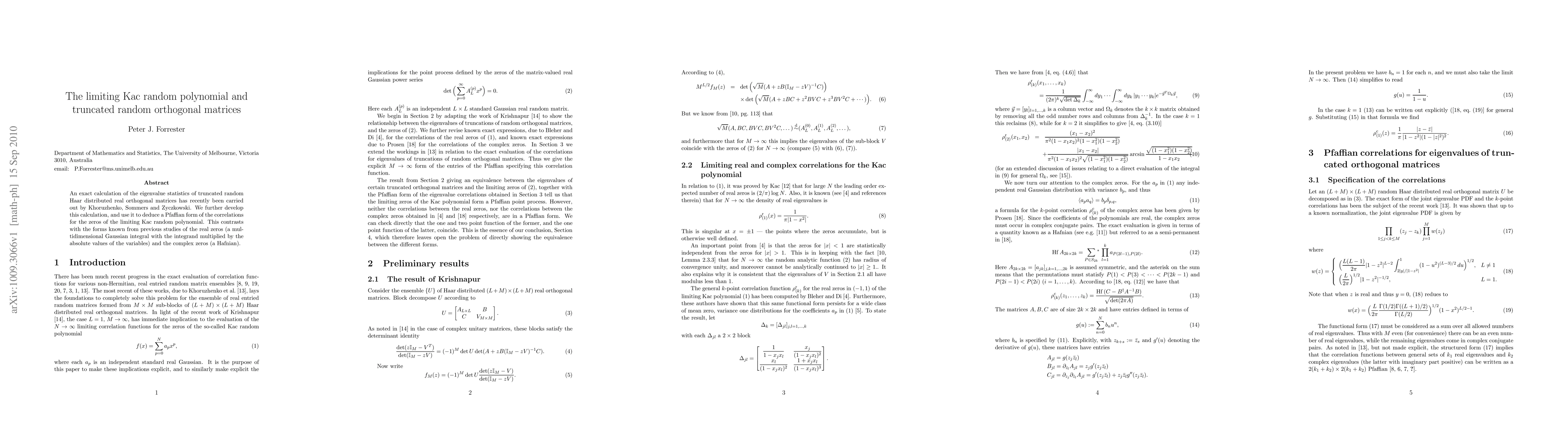 Researchers develop a new method to calculate the eigenvalue statistics of truncated random Haar distributed real orthogonal matrices, leading to a Pfaffian form of correlations for the zeros of the limiting Kac random polynomial.