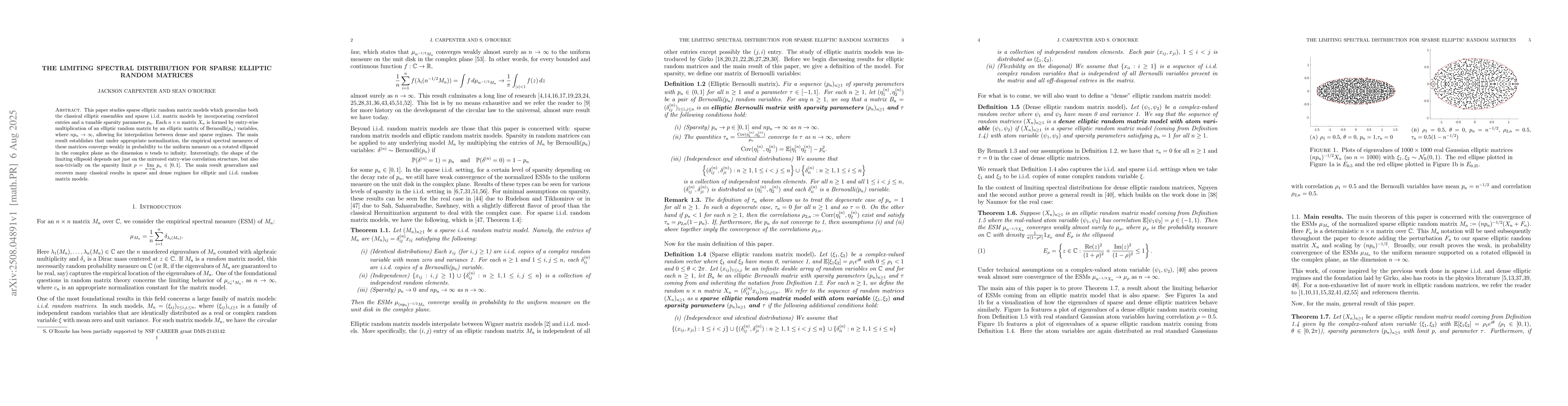 This paper studies sparse elliptic random matrix models which generalize both the classical elliptic ensembles and sparse i.i.d. matrix models by incorporating correlated entries and a tunable sparsity parameter $p_n$. Each $n\times n$ matrix $X_n$ is formed by entry-wise multiplication of an elliptic random matrix by an elliptic matrix of Bernoulli($p_n$) variables, where $np_n\to\infty$, allowing for interpolation between dense and sparse regimes. The main result establishes that under appropriate normalization, the empirical spectral measures of these matrices converge weakly in probability to the uniform measure on a rotated ellipsoid in the complex plane as the dimension $n$ tends to infinity. Interestingly, the shape of the limiting ellipsoid depends not just on the mirrored entry-wise correlation structure, but also non-trivially on the sparsity limit $p=\lim\limits_{n\to\infty}p_n\in[0,1]$. The main result generalizes and recovers many classical results in sparse and dense regimes for elliptic and i.i.d. random matrix models.