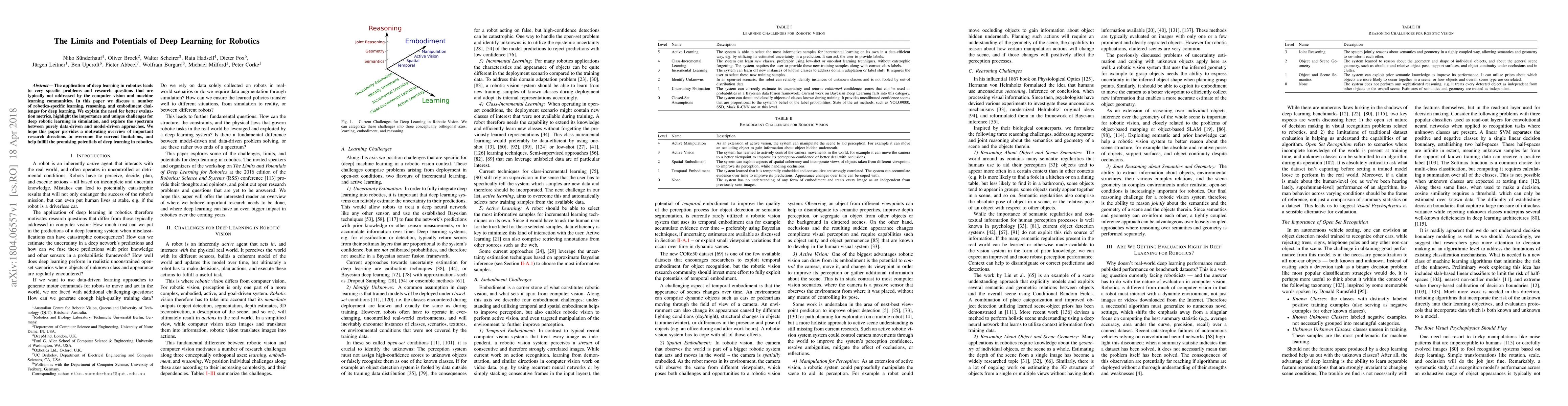 The application of deep learning in robotics leads to very specific problems and research questions that are typically not addressed by the computer vision and machine learning communities. In this paper we discuss a number of robotics-specific learning, reasoning, and embodiment challenges for deep learning. We explain the need for better evaluation metrics, highlight the importance and unique challenges for deep robotic learning in simulation, and explore the spectrum between purely data-driven and model-driven approaches. We hope this paper provides a motivating overview of important research directions to overcome the current limitations, and help fulfill the promising potentials of deep learning in robotics.