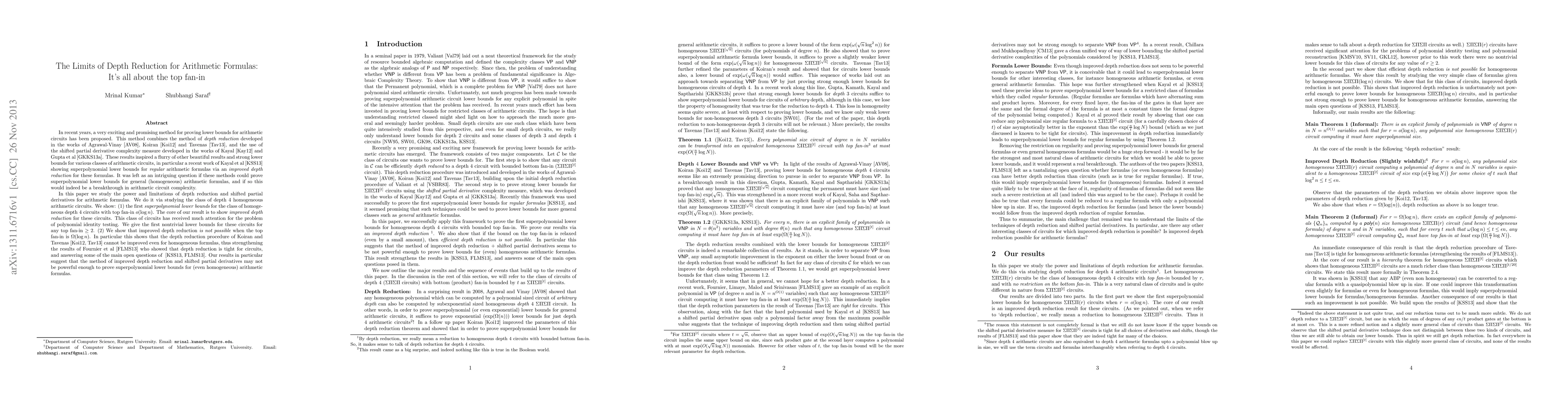 In recent years, a very exciting and promising method for proving lower bounds for arithmetic circuits has been proposed. This method combines the method of {\it depth reduction} developed in the works of Agrawal-Vinay [AV08], Koiran [Koi12] and Tavenas [Tav13], and the use of the shifted partial derivative complexity measure developed in the works of Kayal [Kay12] and Gupta et al [GKKS13a]. These results inspired a flurry of other beautiful results and strong lower bounds for various classes of arithmetic circuits, in particular a recent work of Kayal et al [KSS13] showing superpolynomial lower bounds for {\it regular} arithmetic formulas via an {\it improved depth reduction} for these formulas. It was left as an intriguing question if these methods could prove superpolynomial lower bounds for general (homogeneous) arithmetic formulas, and if so this would indeed be a breakthrough in arithmetic circuit complexity. In this paper we study the power and limitations of depth reduction and shifted partial derivatives for arithmetic formulas. We do it via studying the class of depth 4 homogeneous arithmetic circuits. We show: (1) the first {\it superpolynomial lower bounds} for the class of homogeneous depth 4 circuits with top fan-in $o(\log n)$. The core of our result is to show {\it improved depth reduction} for these circuits. (2) We show that improved depth reduction {\it is not possible} when the top fan-in is $\Omega(\log n)$. In particular this shows that the depth reduction procedure of Koiran and Tavenas [Koi12, Tav13] cannot be improved even for homogeneous formulas, thus strengthening the results of Fournier et al [FLMS13] who showed that depth reduction is tight for circuits, and answering some of the main open questions of [KSS13, FLMS13].