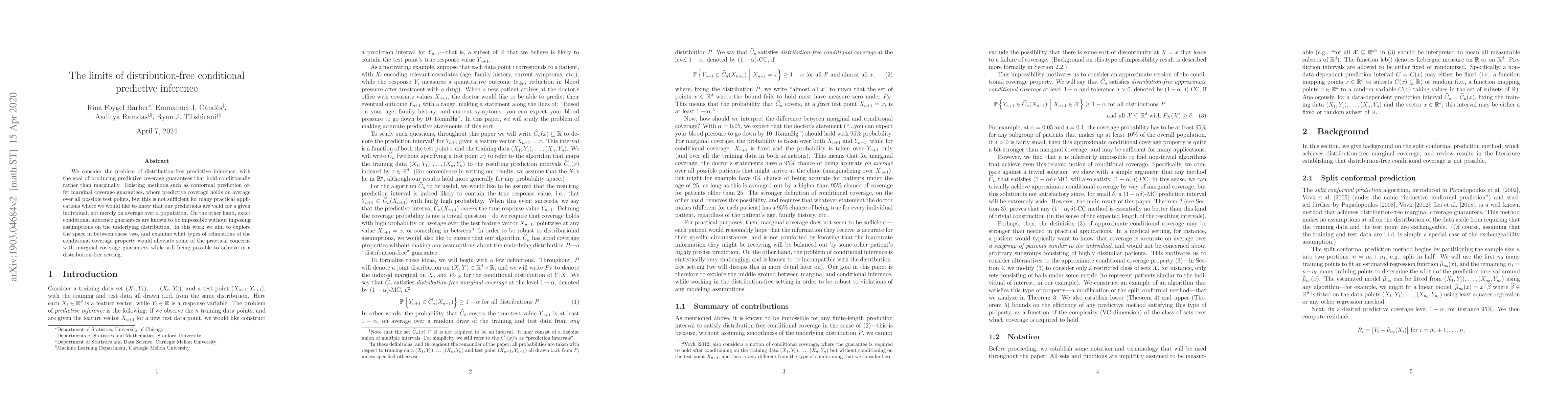 This paper explores methods for achieving distribution-free conditional predictive inference, aiming to provide valid predictive coverage guarantees for specific individuals rather than just averages over populations. It investigates potential relaxations of conditional coverage that can bridge the gap between impossible exact conditional guarantees and existing marginal coverage methods.