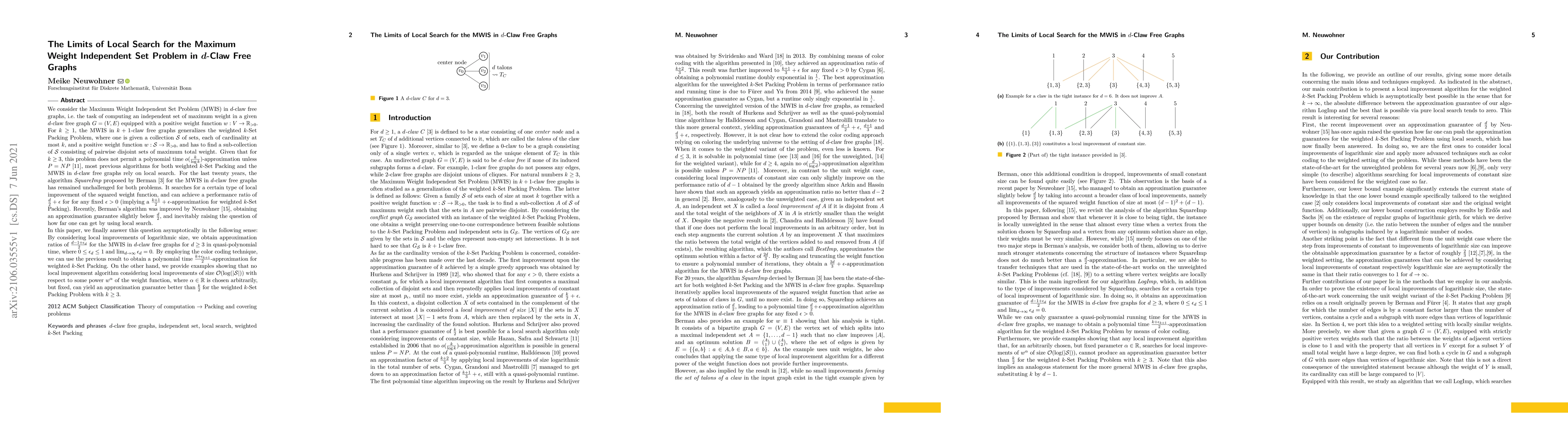 This paper investigates the Maximum Weight Independent Set Problem in $d$-claw free graphs, concluding that local search algorithms, despite recent improvements, have asymptotic limits for $d\geq 3$. The authors achieve a $\frac{d-1+\epsilon_d}{2}$ approximation ratio in quasi-polynomial time and a $\frac{k+\epsilon_{k+1}}{2}$ ratio in polynomial time for weighted $k$-Set Packing, while proving that no local search approach can surpass a $\frac{k}{2}$ approximation for $k\geq 3$.