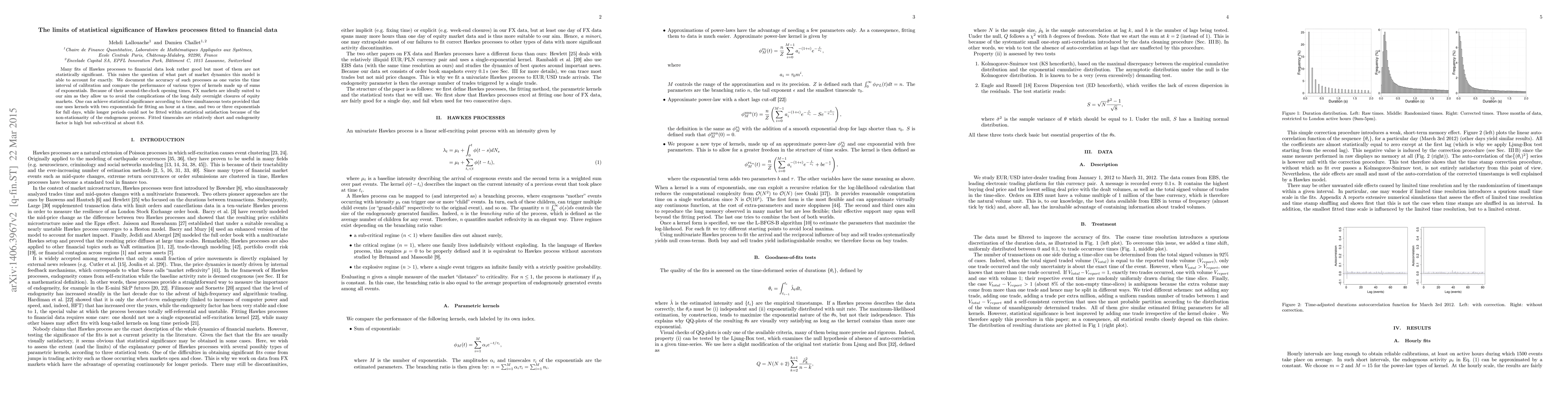 This paper investigates the statistical significance of Hawkes processes fitted to financial data, particularly in FX markets, and finds that while short-term fits show promise, longer-term fits fail due to non-stationarity and high endogeneity. Optimal kernels with two exponentials for hourly fits and two to three for daily fits achieve statistical significance.