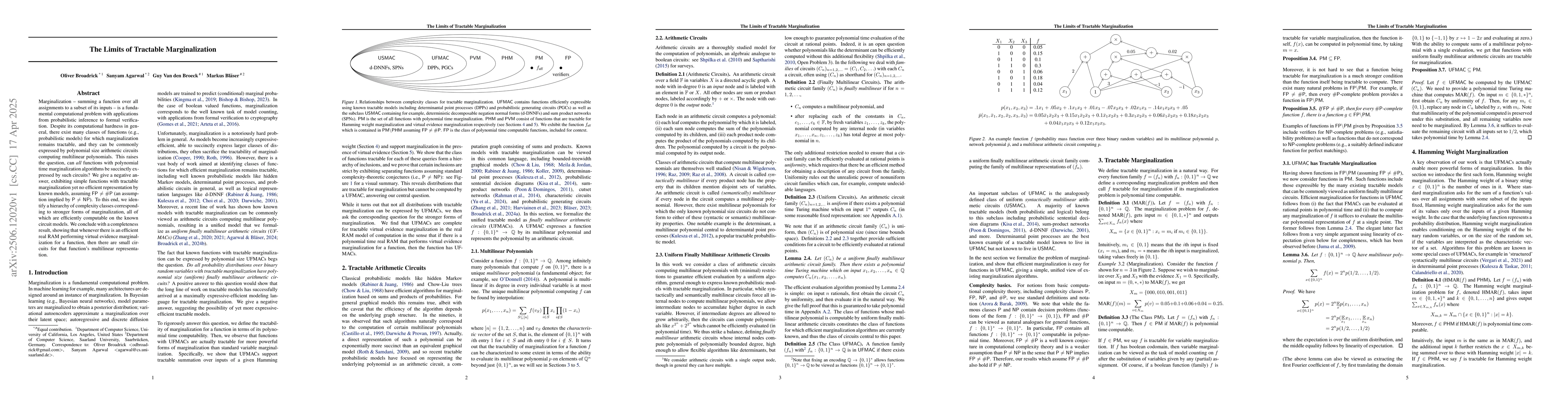 Marginalization -- summing a function over all assignments to a subset of its inputs -- is a fundamental computational problem with applications from probabilistic inference to formal verification. Despite its computational hardness in general, there exist many classes of functions (e.g., probabilistic models) for which marginalization remains tractable, and they can be commonly expressed by polynomial size arithmetic circuits computing multilinear polynomials. This raises the question, can all functions with polynomial time marginalization algorithms be succinctly expressed by such circuits? We give a negative answer, exhibiting simple functions with tractable marginalization yet no efficient representation by known models, assuming $\textsf{FP}\neq\#\textsf{P}$ (an assumption implied by $\textsf{P} \neq \textsf{NP}$). To this end, we identify a hierarchy of complexity classes corresponding to stronger forms of marginalization, all of which are efficiently computable on the known circuit models. We conclude with a completeness result, showing that whenever there is an efficient real RAM performing virtual evidence marginalization for a function, then there are small circuits for that function's multilinear representation.