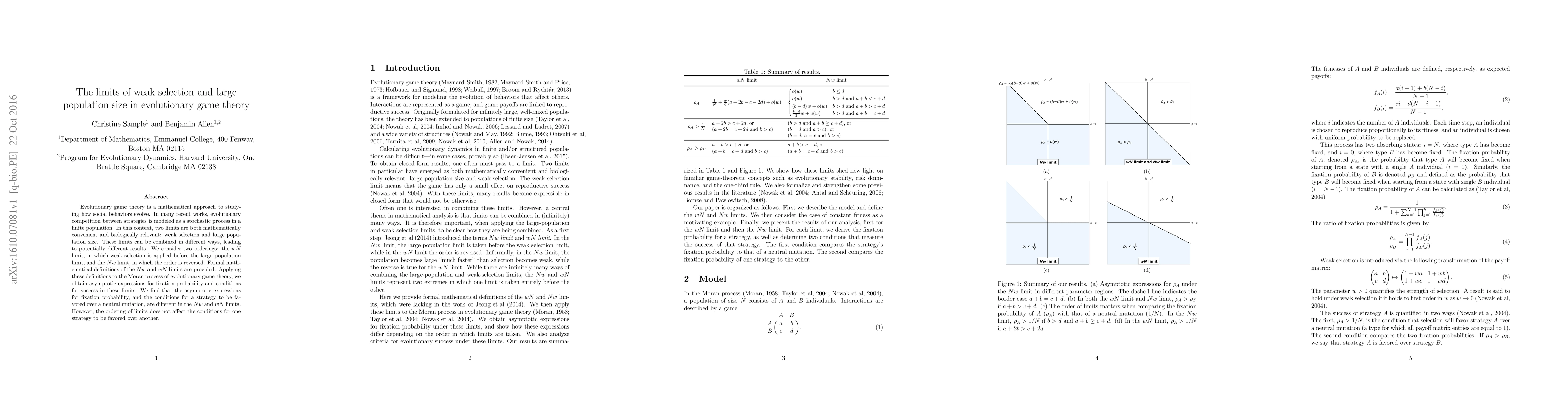 This paper examines the implications of weak selection and large population size in evolutionary game theory, finding that the order of applying these limits—Nw versus wN—affects the fixation probability and success conditions for strategies but not the relative favorability between competing strategies.