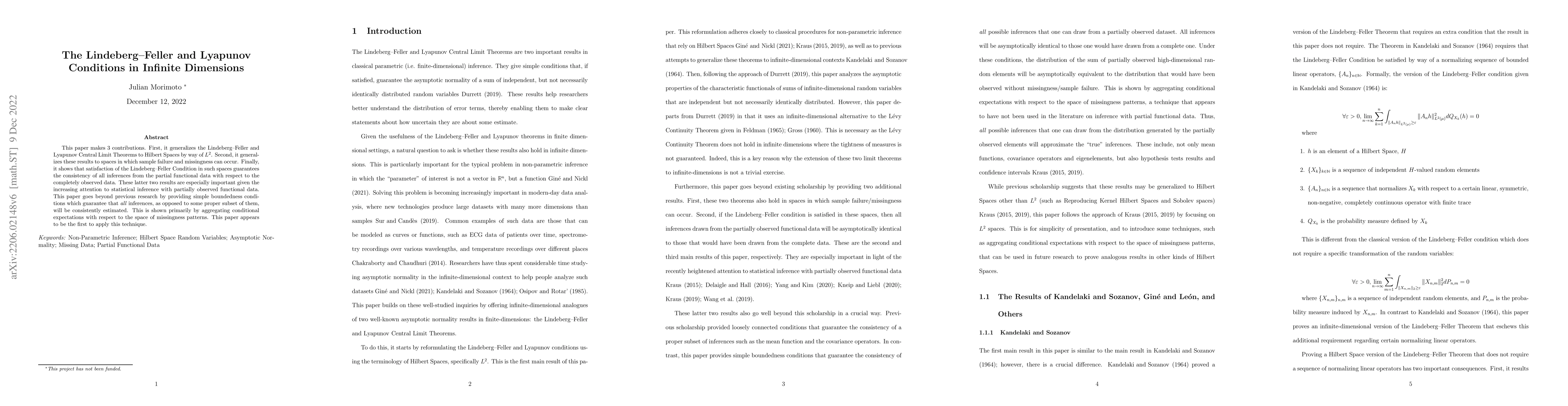 This paper generalizes the Lindeberg-Feller and Lyapunov Central Limit Theorems to Hilbert and partially observed functional data spaces, ensuring the consistency of all inferences from incomplete to complete data. It introduces simple boundedness conditions that guarantee consistent estimation of all inferences, a novel approach using conditional expectations aggregated over missingness patterns.