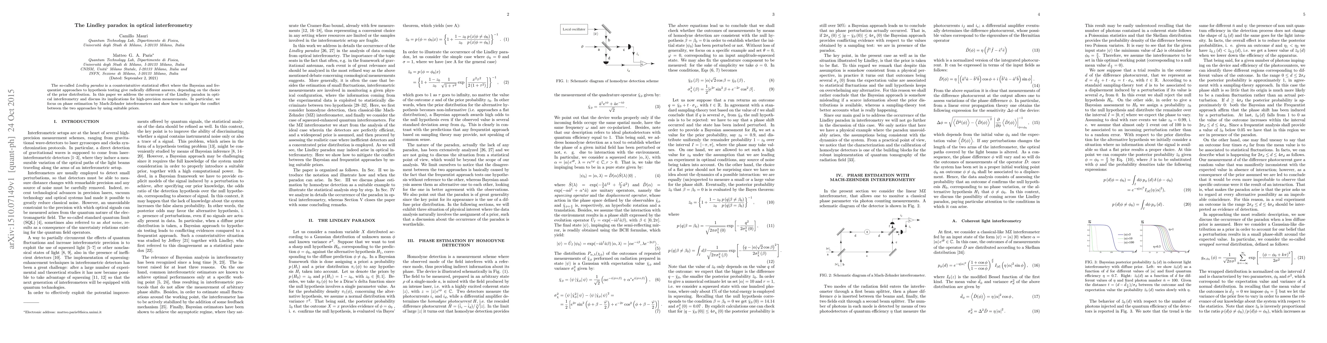 The Lindley paradox reveals a discrepancy between Bayesian and frequentist hypothesis testing, particularly in optical interferometry's phase estimation. The paper discusses strategies to reconcile these differences using appropriate prior distributions in high-precision measurements.