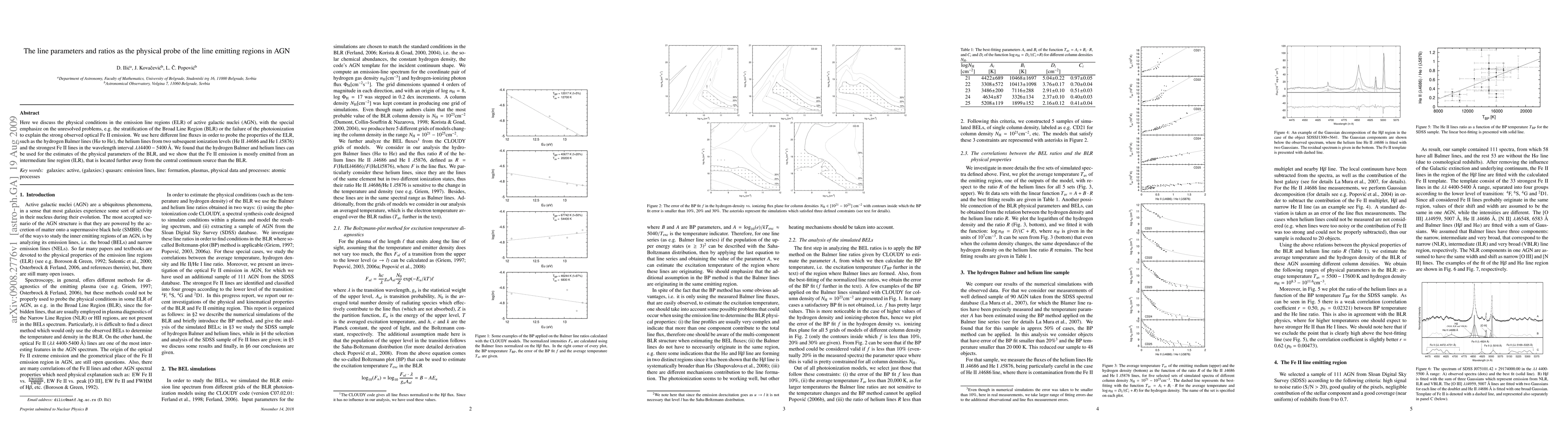 Here we discuss the physical conditions in the emission line regions (ELR) of active galactic nuclei (AGN), with the special emphasize on the unresolved problems, e.g. the stratification of the Broad Line Region (BLR) or the failure of the photoionization to explain the strong observed optical Fe II emission. We use here different line fluxes in order to probe the properties of the ELR, such as the hydrogen Balmer lines (Ha to He), the helium lines from two subsequent ionization levels (He II 4686 and He I 5876) and the strongest Fe II lines in the wavelength interval 4400-5400 \AA. We found that the hydrogen Balmer and helium lines can be used for the estimates of the physical parameters of the BLR, and we show that the Fe II emission is mostly emitted from an intermediate line region (ILR), that is located further away from the central continuum source than the BLR.