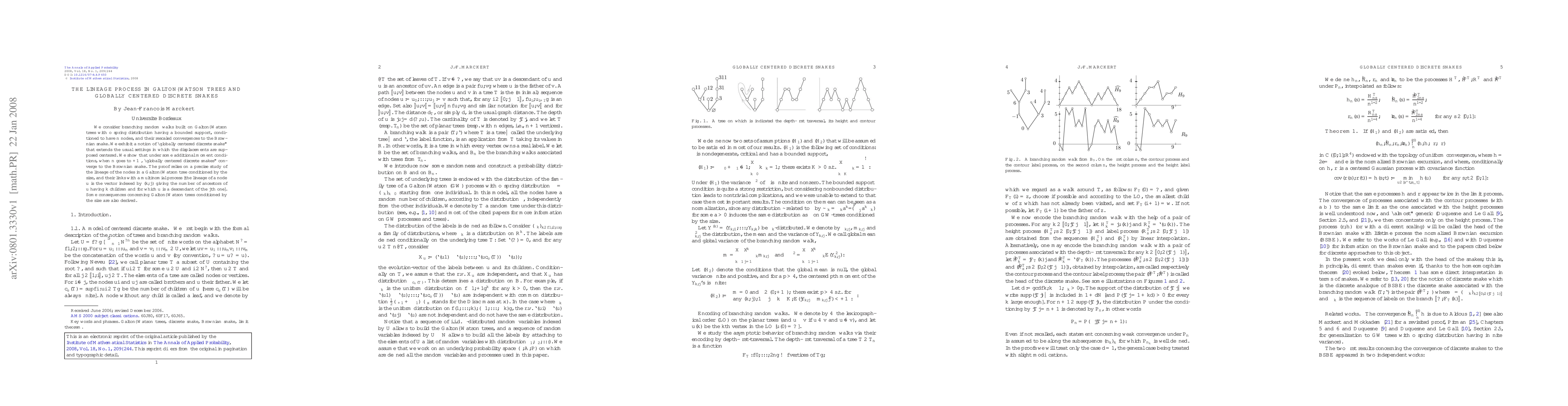 We consider branching random walks built on Galton--Watson trees with offspring distribution having a bounded support, conditioned to have $n$ nodes, and their rescaled convergences to the Brownian snake. We exhibit a notion of ``globally centered discrete snake'' that extends the usual settings in which the displacements are supposed centered. We show that under some additional moment conditions, when $n$ goes to $+\infty$, ``globally centered discrete snakes'' converge to the Brownian snake. The proof relies on a precise study of the lineage of the nodes in a Galton--Watson tree conditioned by the size, and their links with a multinomial process [the lineage of a node $u$ is the vector indexed by $(k,j)$ giving the number of ancestors of $u$ having $k$ children and for which $u$ is a descendant of the $j$th one]. Some consequences concerning Galton--Watson trees conditioned by the size are also derived.