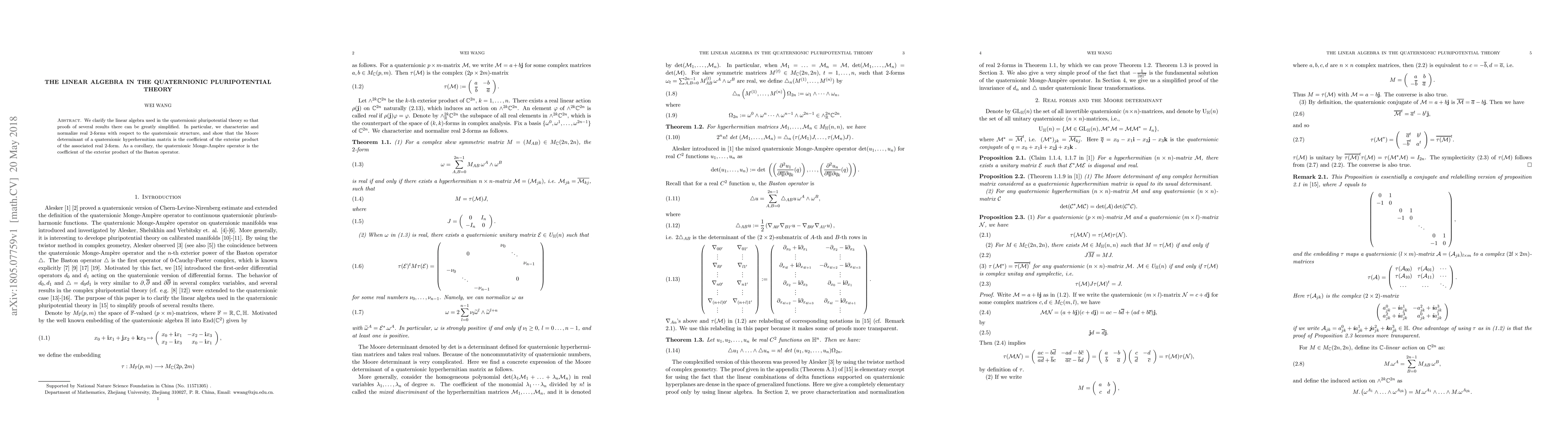 This paper simplifies proofs in quaternionic pluripotential theory by clarifying linear algebra concepts, specifically characterizing and normalizing real $2$-forms with respect to quaternionic structure. It also establishes the Moore determinant of quaternionic hyperhermitian matrices as the coefficient of the exterior product of associated real $2$-forms, leading to a corollary that the quaternionic Monge-Ampère operator is the coefficient of the exterior product of the Baston operator.