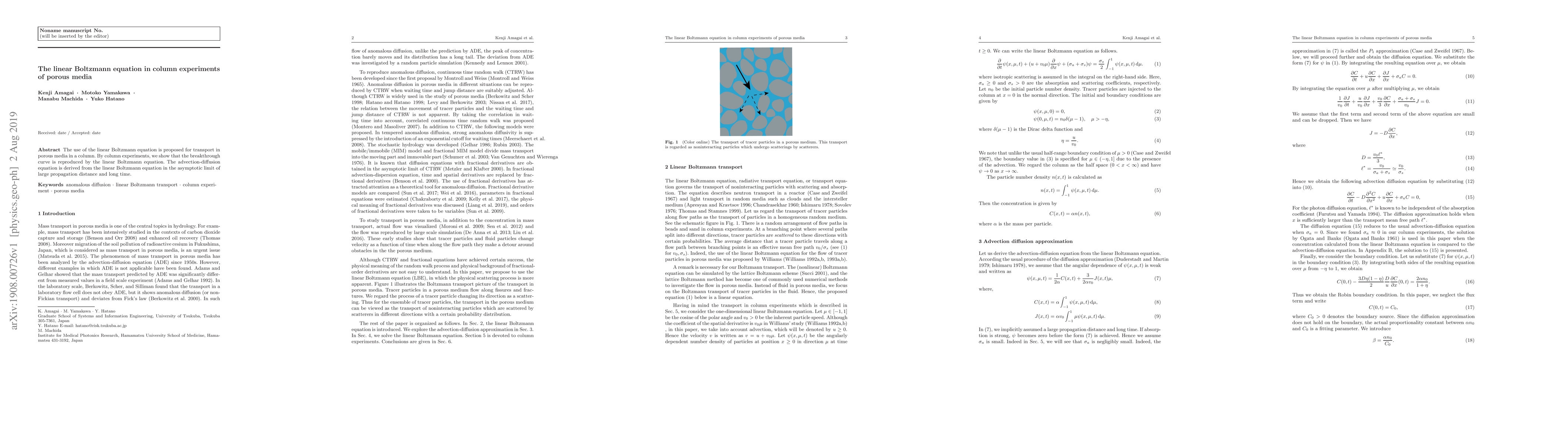 The use of the linear Boltzmann equation is proposed for transport in porous media in a column. By column experiments, we show that the breakthrough curve is reproduced by the linear Boltzmann equation. The advection-diffusion equation is derived from the linear Boltzmann equation in the asymptotic limit of large propagation distance and long time.