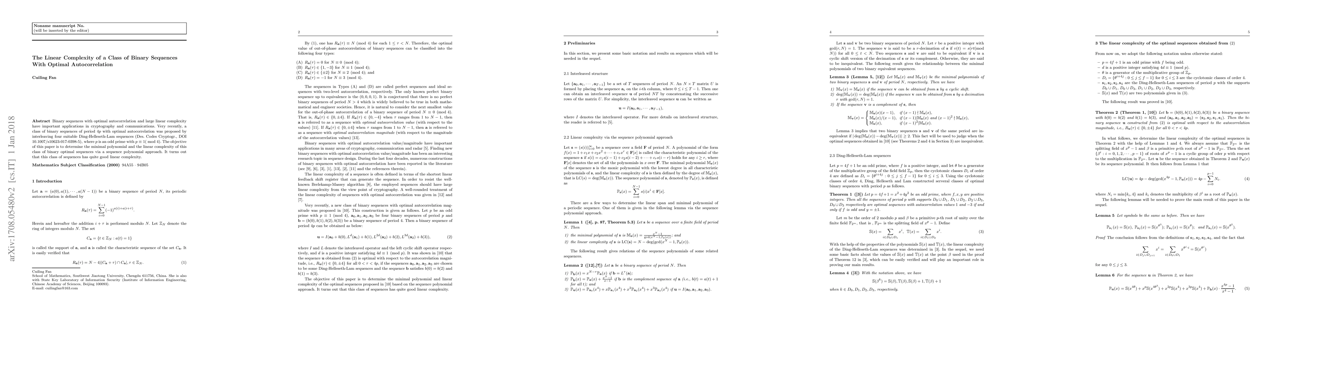 This paper investigates a class of binary sequences with optimal autocorrelation and period $4p$, where $p$ is an odd prime. It determines the minimal polynomial and finds that these sequences exhibit good linear complexity, making them valuable for cryptographic and communication applications.