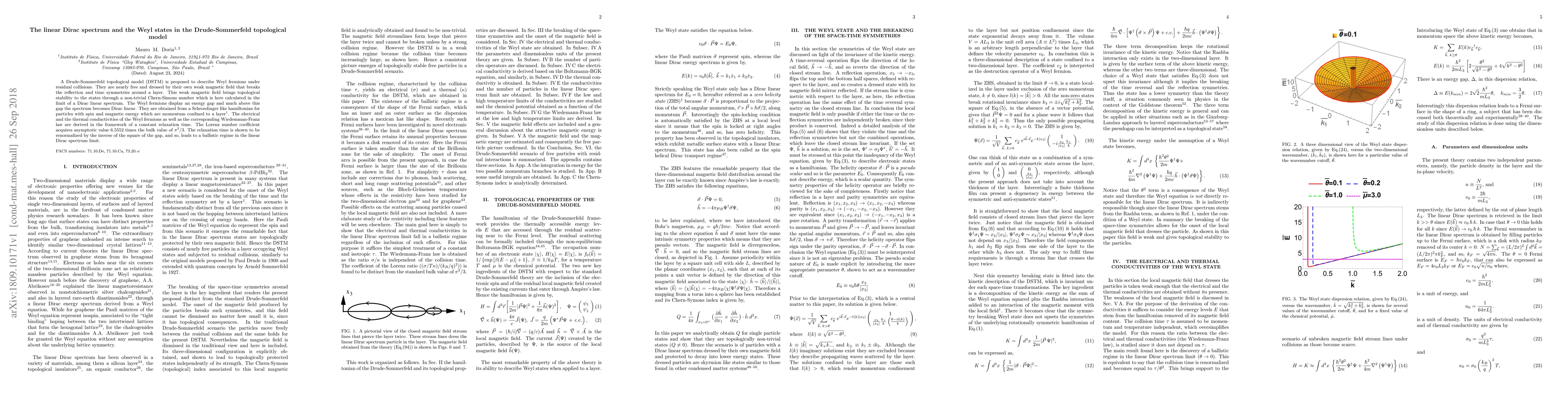 The Drude-Sommerfeld topological model proposes a framework for describing Weyl fermions under residual collisions, attributing topological stability to a non-trivial Chern-Simons number. The model predicts a Dirac linear spectrum above the energy gap, with derived electrical and thermal conductivities showing a ballistic regime in the limit of a large relaxation time.