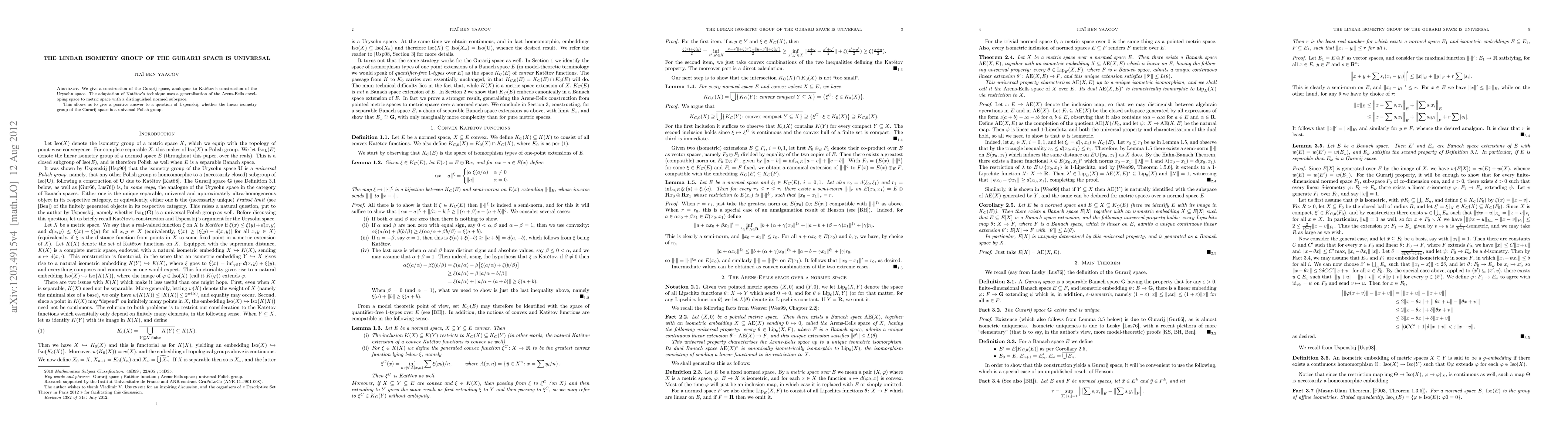 The paper constructs the Gurarij space using a method similar to Katetov's construction of the Urysohn space, proving that the linear isometry group of the Gurarij space is a universal Polish group, answering Uspenskij's question affirmatively.
