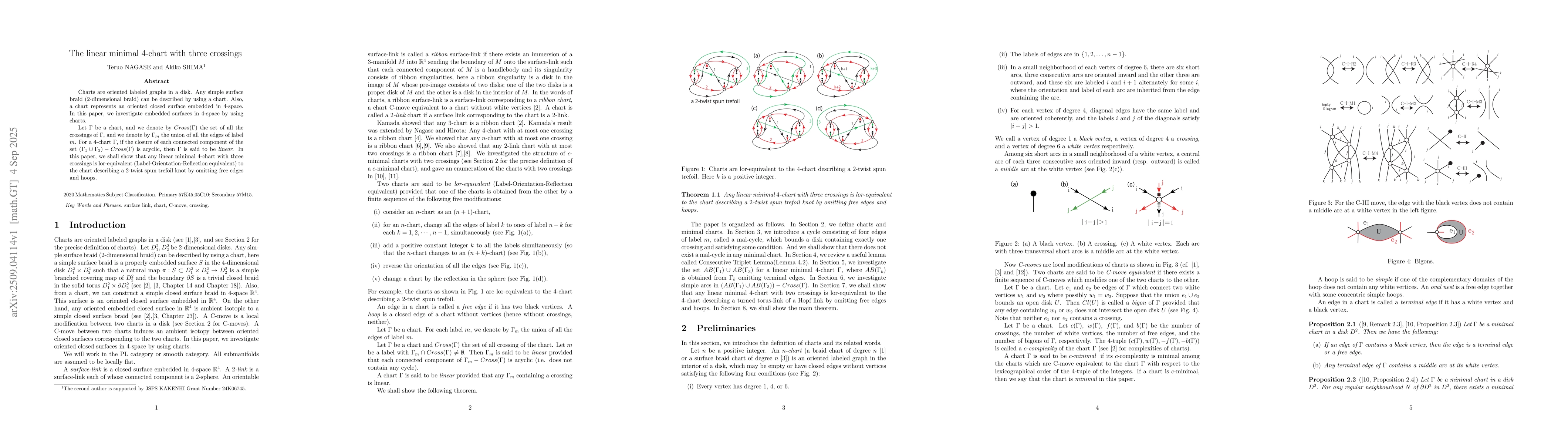 Charts are oriented labeled graphs in a disk. Any simple surface braid (2-dimensional braid) can be described by using a chart. Also, a chart represents an oriented closed surface embedded in 4-space. In this paper, we investigate embedded surfaces in 4-space by using charts. Let $\Gamma$ be a chart, and we denote by $Cross(\Gamma)$ the set of all the crossings of $\Gamma$, and we denote by $\Gamma_m$ the union of all the edges of label $m$. For a 4-chart $\Gamma$, if the closure of each connected component of the set $(\Gamma_1\cup \Gamma_3)-Cross(\Gamma)$ is acyclic, then $\Gamma$ is said to be {\it linear}. In this paper, we shall show that any linear minimal $4$-chart with three crossings is lor-equivalent (Label-Orientation-Reflection equivalent) to the chart describing a $2$-twist spun trefoil knot by omitting free edges and hoops.
