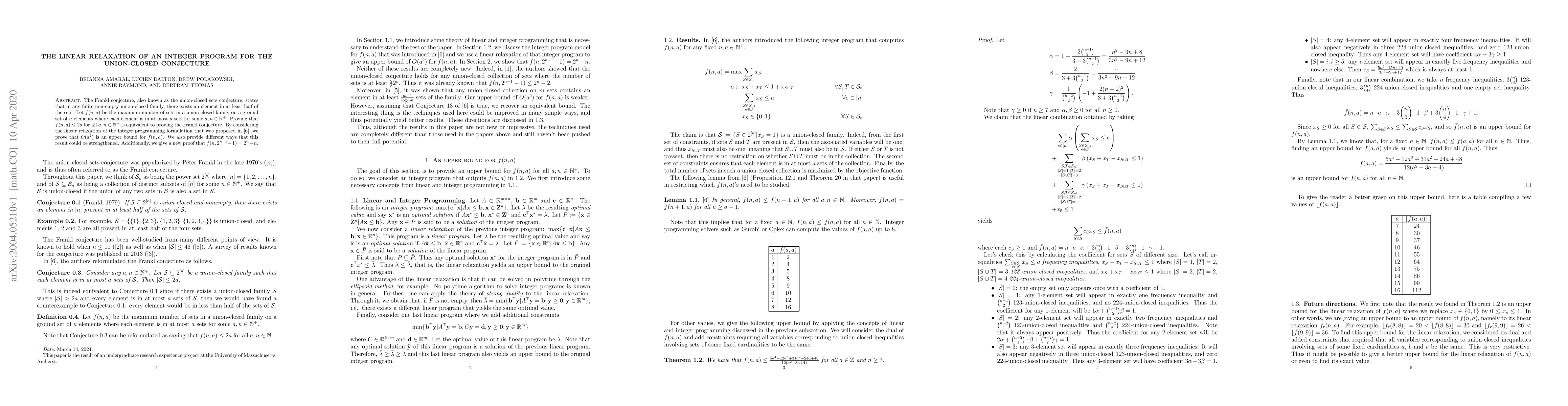 The Frankl conjecture, also known as the union-closed sets conjecture, states that in any finite non-empty union-closed family, there exists an element in at least half of the sets. Let $f(n,a)$ be the maximum number of sets in a union-closed family on a ground set of $n$ elements where each element is in at most $a$ sets for some $a,n\in \mathbb{N}^+$. Proving that $f(n,a)\leq 2a$ for all $a, n \in \mathbb{N}^+$ is equivalent to proving the Frankl conjecture. By considering the linear relaxation of the integer programming formulation that was proposed in New Conjectures for Union-Closed Families by Pulaj, Raymond and Theis, we prove that $O(a^2)$ is an upper bound for $f(n,a)$. We also provide different ways that this result could be strengthened. Additionally, we give a new proof that $f(n,2^{n-1}-1)=2^n-n$.