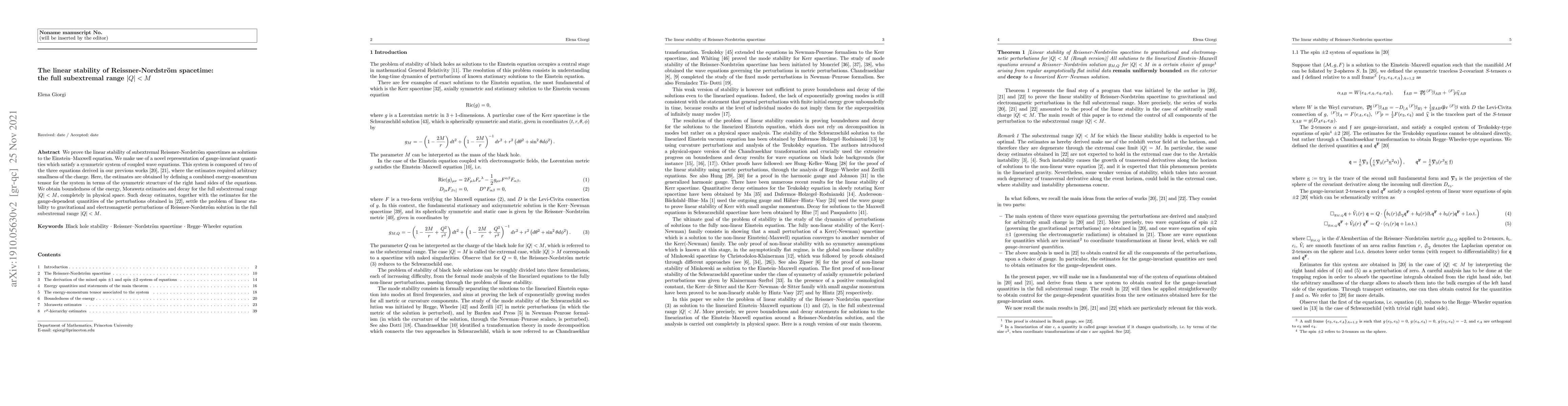 This paper proves the linear stability of subextremal Reissner-Nordström spacetimes by establishing boundedness, Morawetz estimates, and decay for gravitational and electromagnetic perturbations, using a novel symmetric system of coupled wave equations. The estimates cover the full subextremal range |Q|<M without requiring arbitrary smallness of the charge.