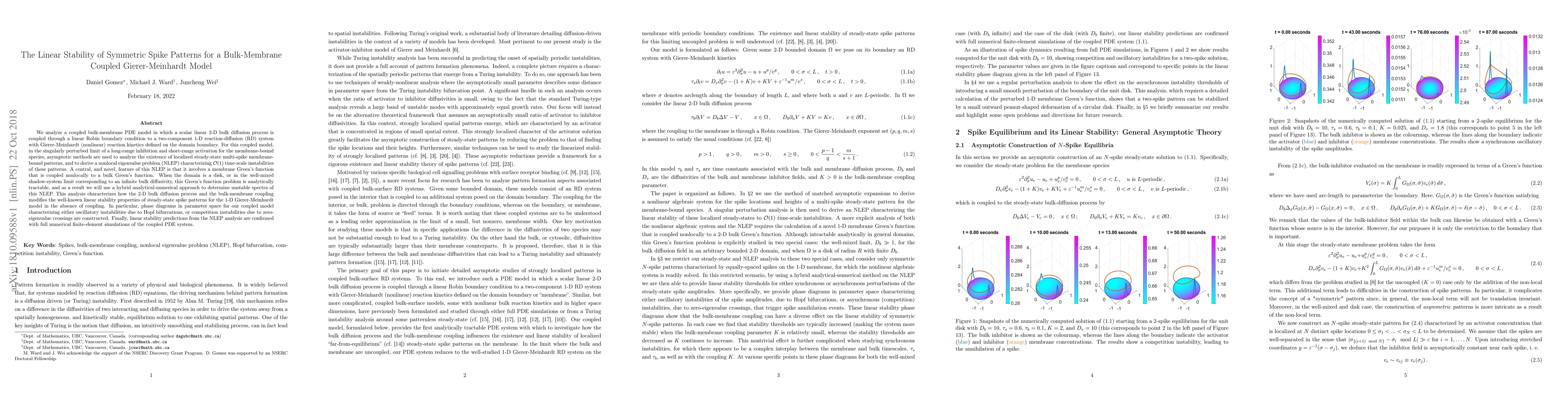 This paper investigates the linear stability of symmetric spike patterns in a coupled bulk-membrane PDE model with Gierer-Meinhardt kinetics on the boundary. It derives a nonlocal eigenvalue problem characterizing instabilities and uses a hybrid analytical-numerical approach to analyze the effects of bulk diffusion and coupling on spike pattern stability.
