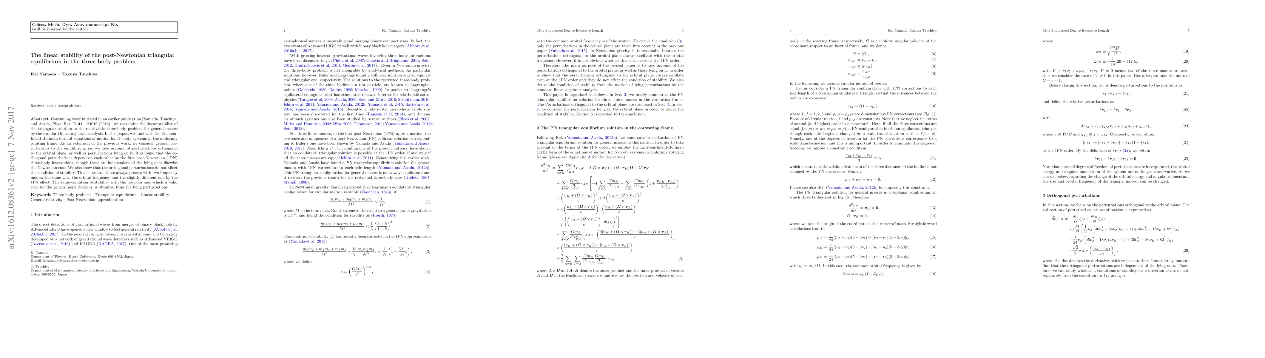 This paper investigates the linear stability of the post-Newtonian triangular equilibrium in the relativistic three-body problem using standard linear algebraic analysis. It finds that orthogonal perturbations do not affect stability, while lying perturbations maintain the same stability condition as in the Newtonian case.