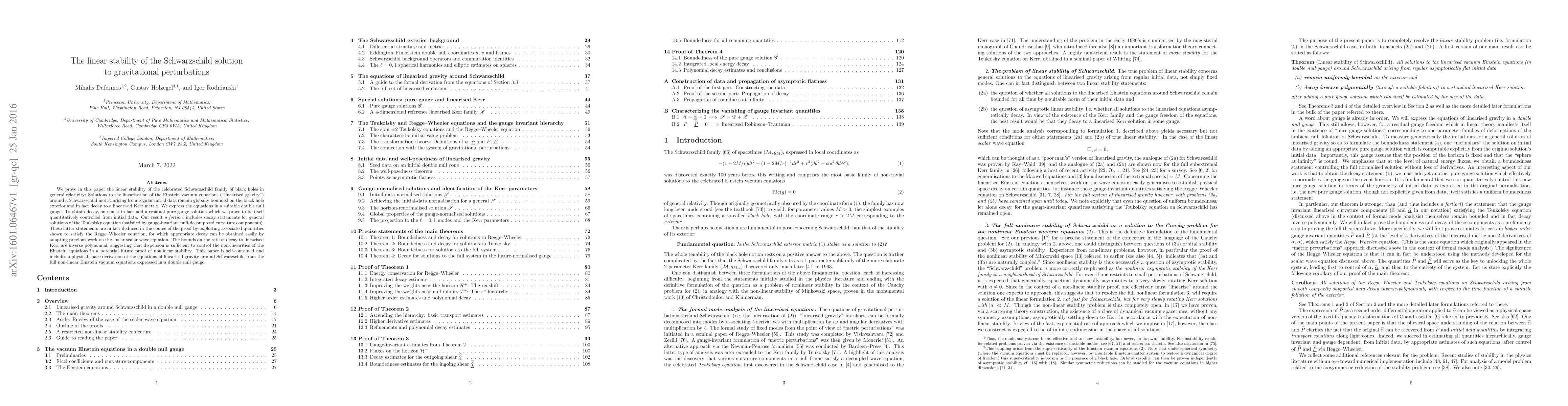 This paper proves the linear stability of Schwarzschild black holes by showing that perturbations decay to a linearised Kerr metric, suggesting dispersion controls non-linearities. The analysis includes a physical-space derivation of linearised gravity equations in a double null gauge and demonstrates decay through the Teukolsky equation.