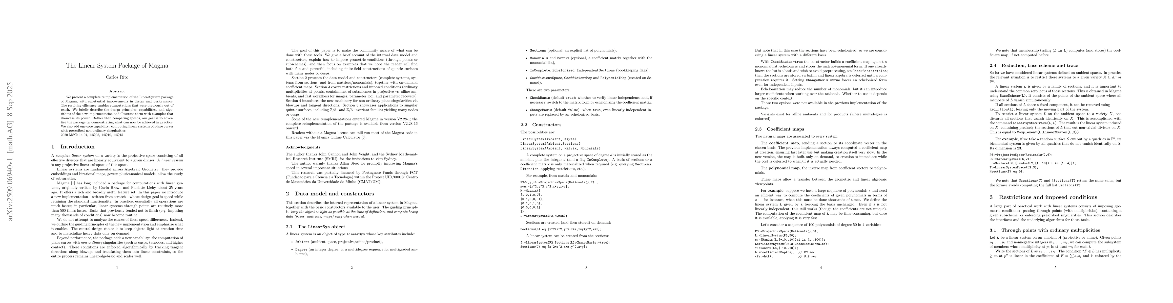 We present a complete reimplementation of the LinearSystem package of Magma, with substantial improvements in design and performance. The resulting efficiency enables computations that were previously out of reach. We briefly describe the design principles, capabilities, and algorithms of the new implementation and illustrate them with examples that showcase its power. Rather than comparing speeds, our goal is to advertise the package by demonstrating what can now be achieved in practice. We also add one core capability: computing linear systems of plane curves with prescribed non-ordinary singularities.