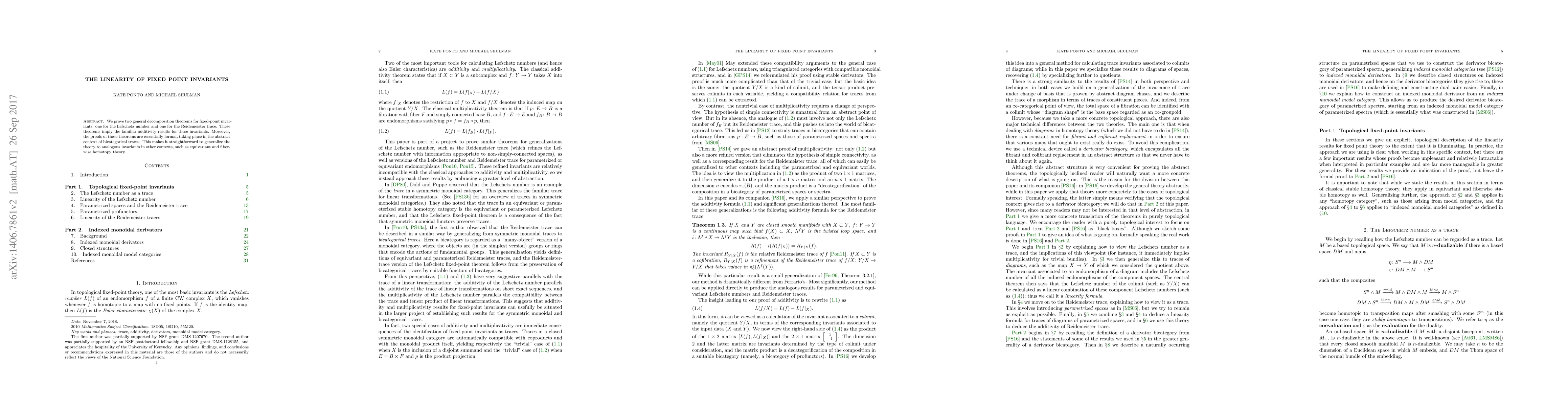 We prove two general decomposition theorems for fixed-point invariants: one for the Lefschetz number and one for the Reidemeister trace. These theorems imply the familiar additivity results for these invariants. Moreover, the proofs of these theorems are essentially formal, taking place in the abstract context of bicategorical traces. This makes it straightforward to generalize the theory to analogous invariants in other contexts, such as equivariant and fiberwise homotopy theory.