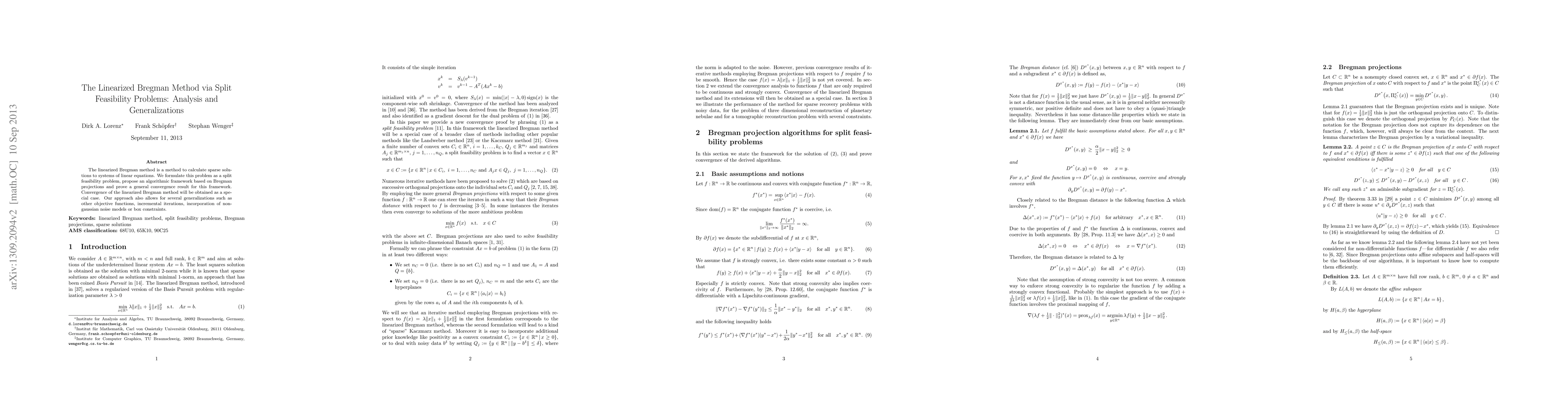 The linearized Bregman method is reformulated as a split feasibility problem, enabling an algorithmic framework based on Bregman projections with proven general convergence. This approach also accommodates various generalizations like alternative objective functions and noise models.