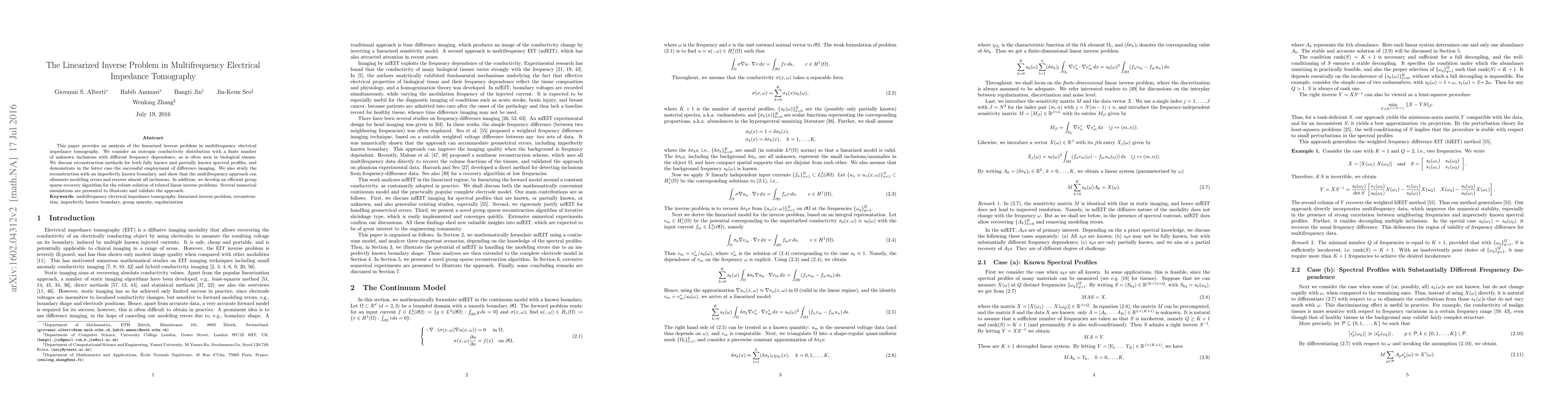 This paper analyzes the linearized inverse problem in multifrequency electrical impedance tomography for biological tissues, focusing on reconstruction methods for known and unknown spectral profiles, and proposes an efficient group sparse recovery algorithm for solving related linear inverse problems, validated through numerical simulations.