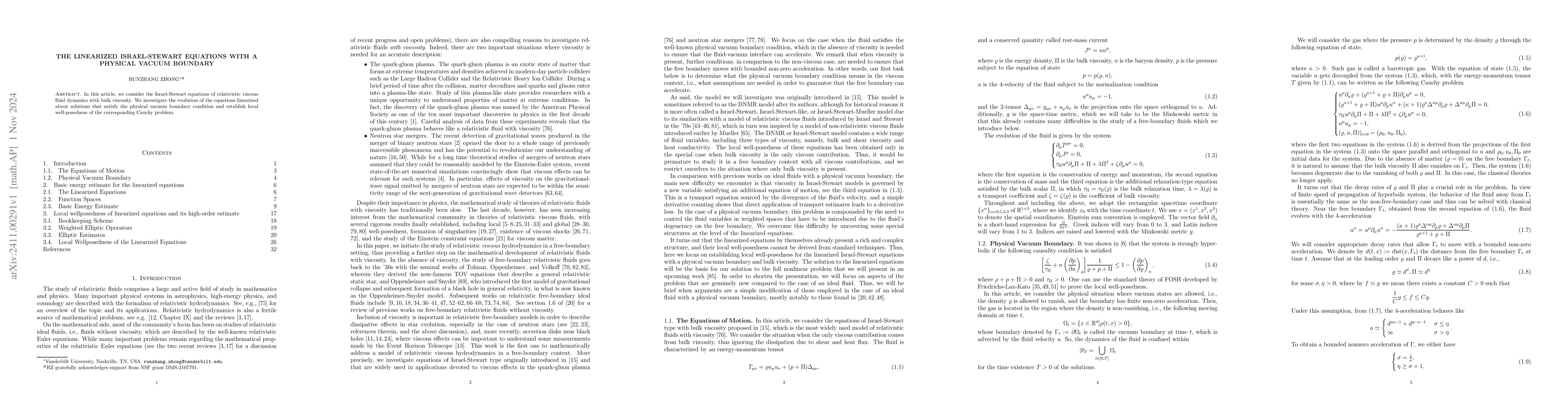 This paper examines linearized Israel-Stewart equations for relativistic viscous fluid dynamics with bulk viscosity, focusing on solutions that meet physical vacuum boundary conditions, and demonstrates local well-posedness for the Cauchy problem.