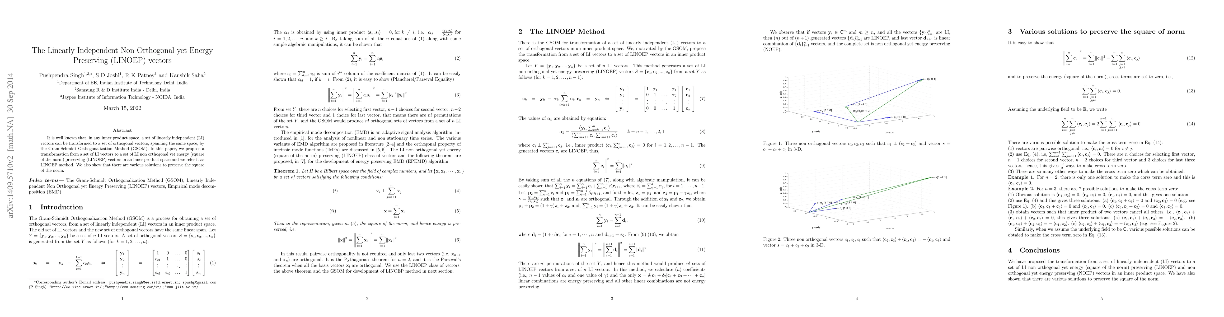 It is well known that, in any inner product space, a set of linearly independent (LI) vectors can be transformed to a set of orthogonal vectors, spanning the same space, by the Gram-Schmidt Orthogonalization Method (GSOM). In this paper, we propose a transformation from a set of LI vectors to a set of LI non orthogonal yet energy (square of the norm) preserving (LINOEP) vectors in an inner product space and we refer it as LINOEP method. We also show that there are various solutions to preserve the square of the norm.