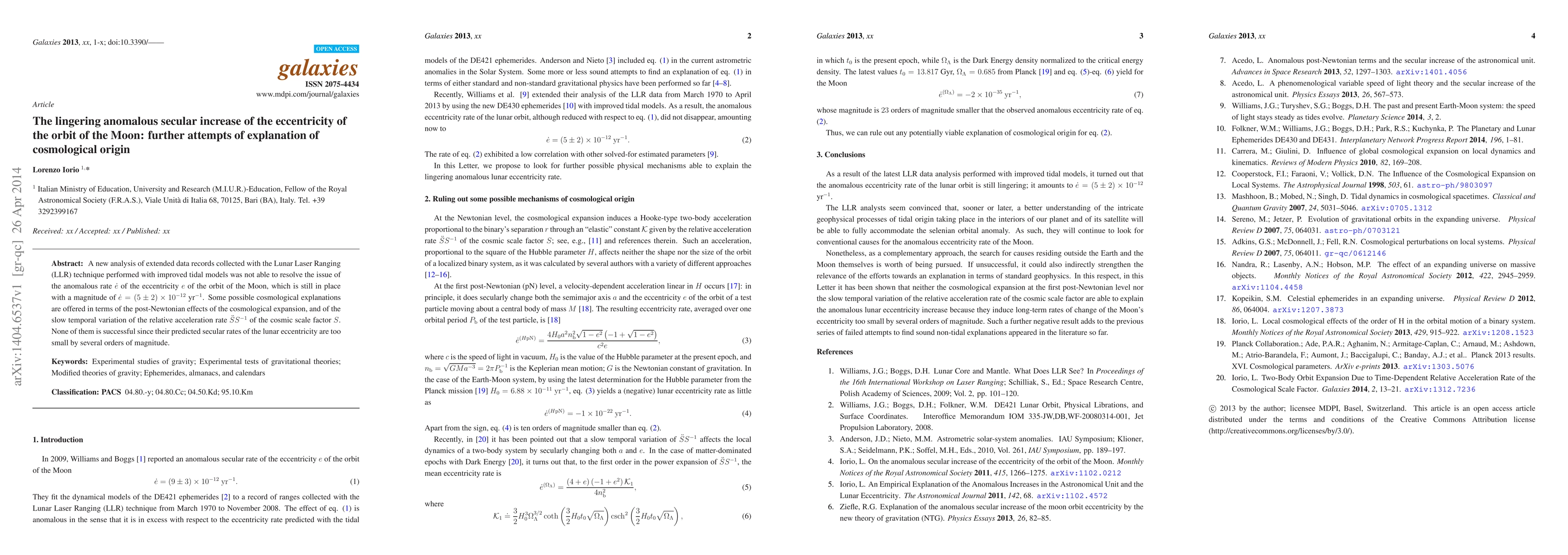 Summary: Despite improved Lunar Laser Ranging data and tidal models, the anomalous increase in the Moon's orbital eccentricity remains unresolved. Proposed cosmological explanations, including effects of cosmic expansion and variations in the cosmic scale factor, fail to match the observed rate, leaving the phenomenon unexplained.