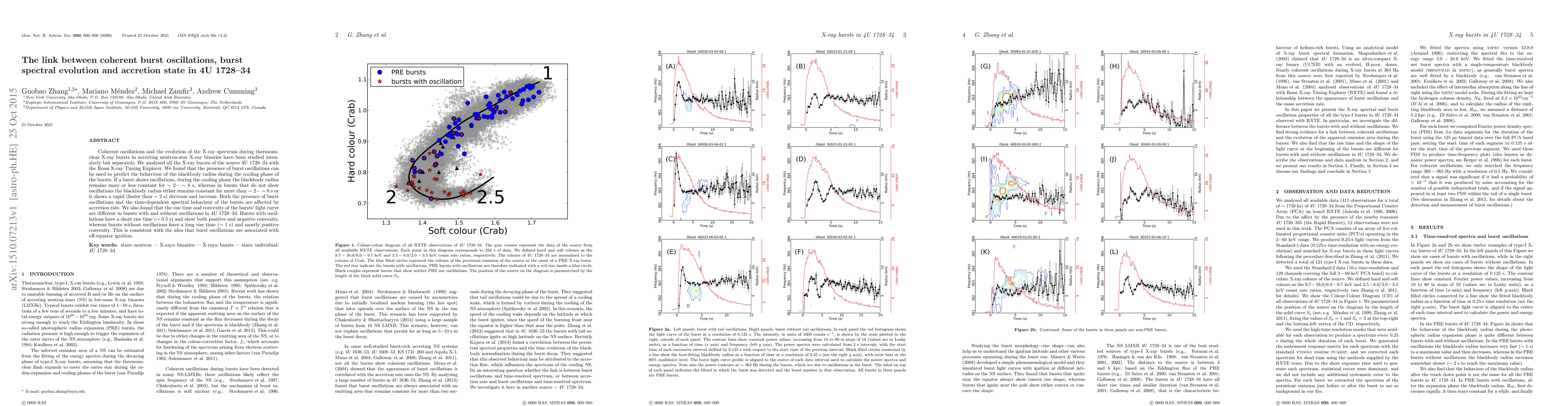 This study investigates the relationship between coherent burst oscillations and spectral evolution in X-ray bursts of the neutron-star X-ray binary 4U 1728-34. The analysis reveals that bursts with oscillations maintain a stable blackbody radius during cooling, while those without show rapid changes, indicating a link to accretion rate and burst dynamics.