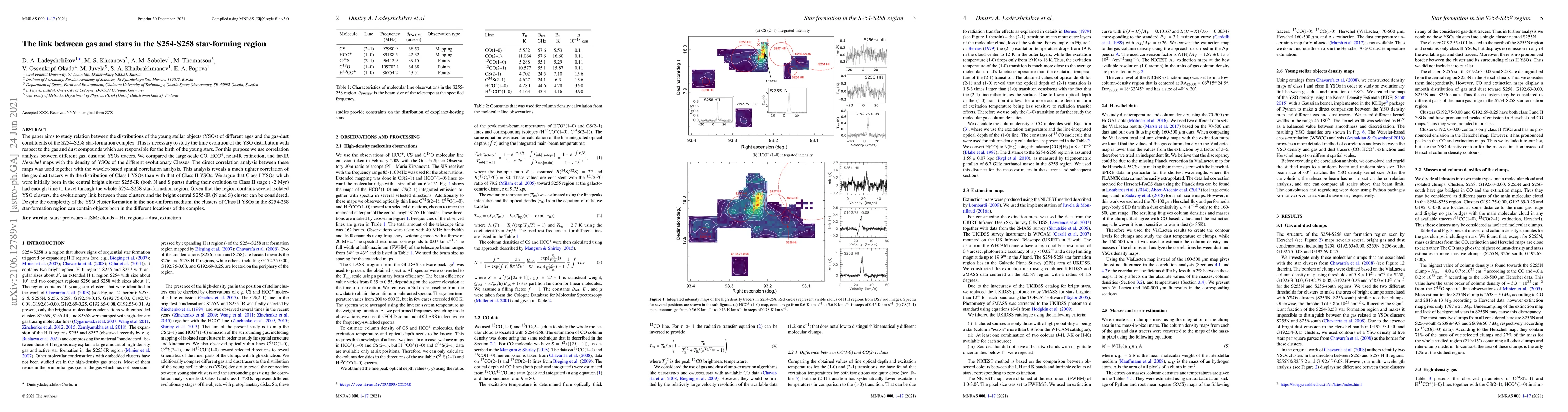 The paper aims to study relation between the distributions of the young stellar objects (YSOs) of different ages and the gas-dust constituents of the S254-S258 star-formation complex. This is necessary to study the time evolution of the YSO distribution with respect to the gas and dust compounds which are responsible for the birth of the young stars. For this purpose we use correlation analysis between different gas, dust and YSOs tracers. We compared the large-scale CO, HCO$^+$, near-IR extinction, and far-IR {\it Herschel} maps with the density of YSOs of the different evolutionary Classes. The direct correlation analysis between these maps was used together with the wavelet-based spatial correlation analysis. This analysis reveals a much tighter correlation of the gas-dust tracers with the distribution of Class I YSOs than with that of Class II YSOs. We argue that Class I YSOs which were initially born in the central bright cluster S255-IR (both N and S parts) during their evolution to Class II stage ($\sim$2 Myr) had enough time to travel through the whole S254-S258 star-formation region. Given that the region contains several isolated YSO clusters, the evolutionary link between these clusters and the bright central S255-IR (N and S) cluster can be considered. Despite the complexity of the YSO cluster formation in the non-uniform medium, the clusters of Class II YSOs in the S254-258 star-formation region can contain objects born in the different locations of the complex.