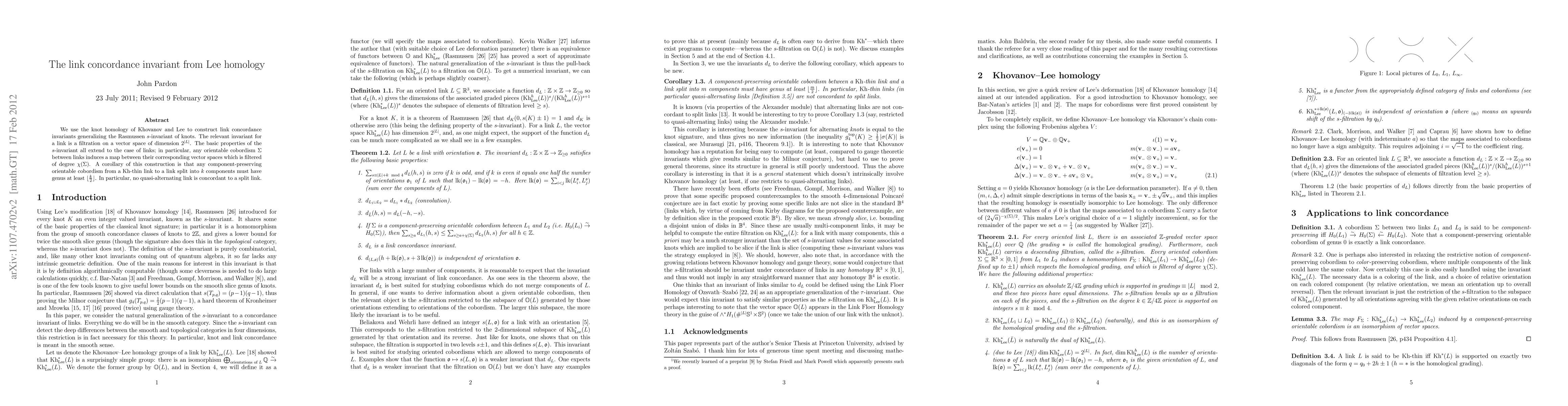 We use the knot homology of Khovanov and Lee to construct link concordance invariants generalizing the Rasmussen $s$-invariant of knots. The relevant invariant for a link is a filtration on a vector space of dimension $2^{|L|}$. The basic properties of the $s$-invariant all extend to the case of links; in particular, any orientable cobordism $\Sigma$ between links induces a map between their corresponding vector spaces which is filtered of degree $\chi(\Sigma)$. A corollary of this construction is that any component preserving orientable cobordism from a $\Kh$-thin link to a link split into $k$ components must have genus at least $\lfloor\frac k2\rfloor$. In particular, no quasi-alternating link is concordant to a split link.