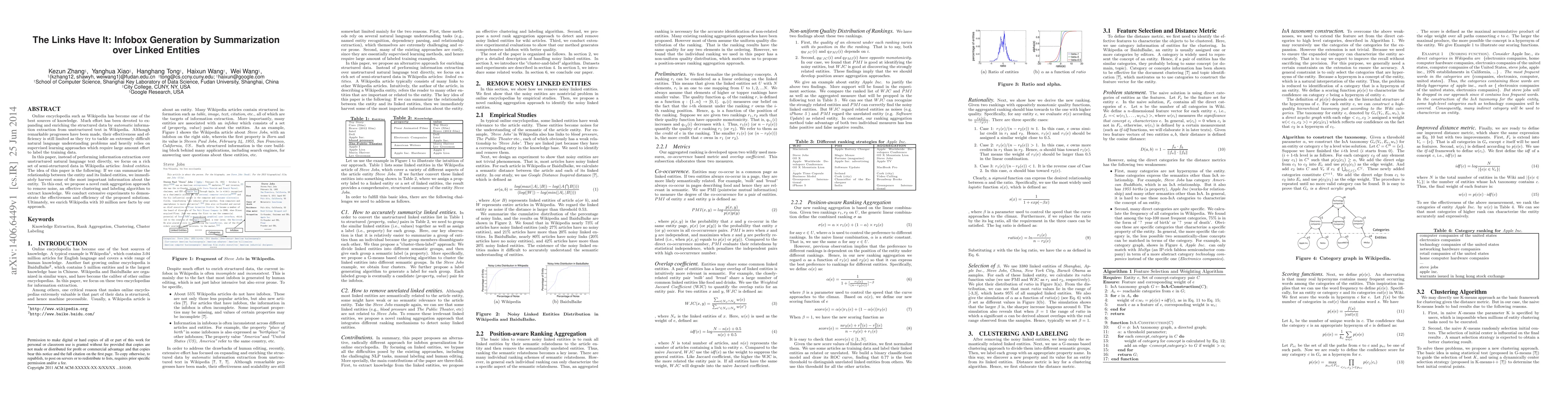 Online encyclopedia such as Wikipedia has become one of the best sources of knowledge. Much effort has been devoted to expanding and enriching the structured data by automatic information extraction from unstructured text in Wikipedia. Although remarkable progresses have been made, their effectiveness and efficiency is still limited as they try to tackle an extremely difficult natural language understanding problems and heavily relies on supervised learning approaches which require large amount effort to label the training data. In this paper, instead of performing information extraction over unstructured natural language text directly, we focus on a rich set of semi-structured data in Wikipedia articles: linked entities. The idea of this paper is the following: If we can summarize the relationship between the entity and its linked entities, we immediately harvest some of the most important information about the entity. To this end, we propose a novel rank aggregation approach to remove noise, an effective clustering and labeling algorithm to extract knowledge.