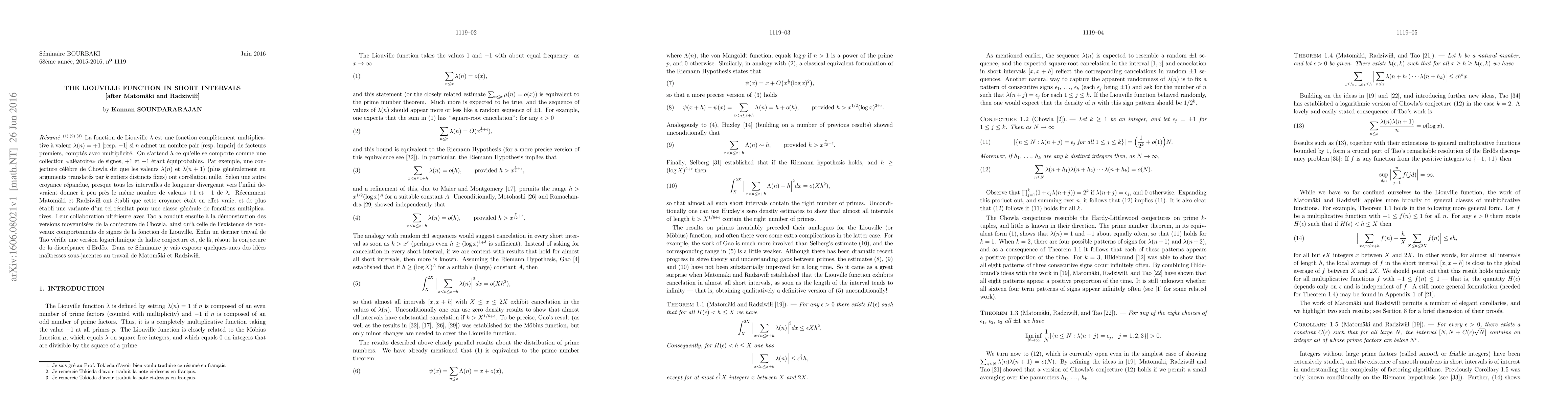Summary: This paper presents results by Matomaki and Radziwill demonstrating that the Liouville function shows cancellation behavior in nearly all short intervals as the interval length increases indefinitely. The findings underscore the Liouville function's statistical properties over short ranges.