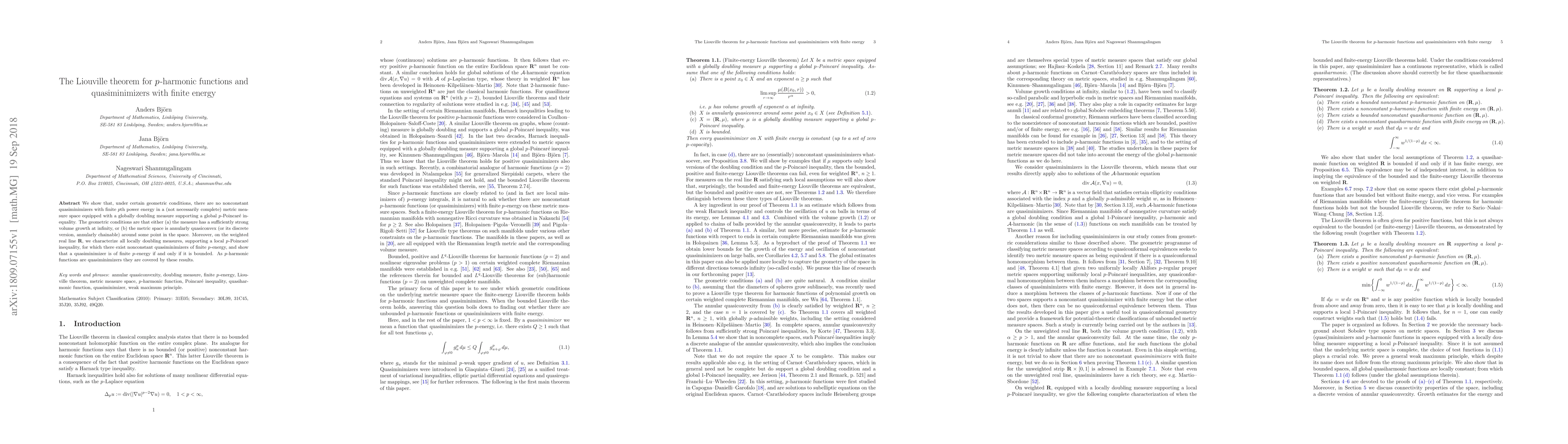 Researchers prove that under specific geometric conditions, there are no nonconstant quasiminimizers with finite p-th power energy in certain metric spaces. The conditions include strong volume growth or annular quasiconvexity around a point.