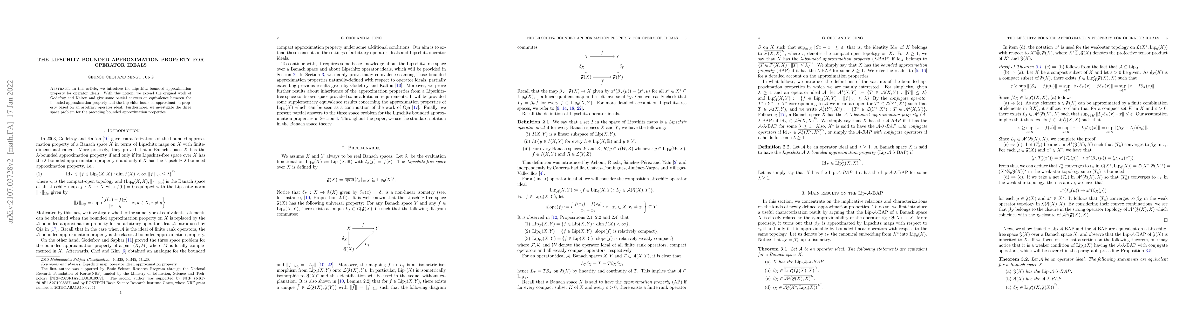 In this article, we introduce the Lipschitz bounded approximation property for operator ideals. With this notion, we extend the original work done by Godefroy and Kalton and give some partial answers on the equivalence between the bounded approximation property and the Lipschitz bounded approximation property based on an arbitrary operator ideal. Furthermore, we investigate the three space problems on the preceding bounded approximation properties.