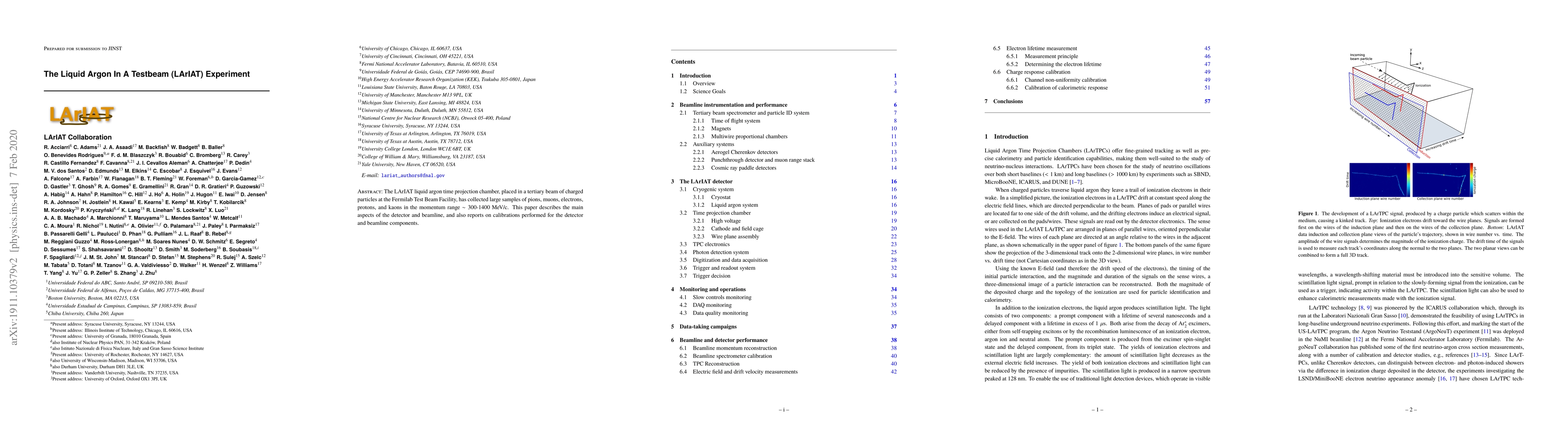 The LArIAT experiment utilizes a liquid argon time projection chamber at the Fermilab Test Beam Facility to study charged particles in a tertiary beam, reporting on detector and beamline calibrations. The experiment collected data on pions, muons, electrons, protons, and kaons within a momentum range of 300-1400 MeV/c.